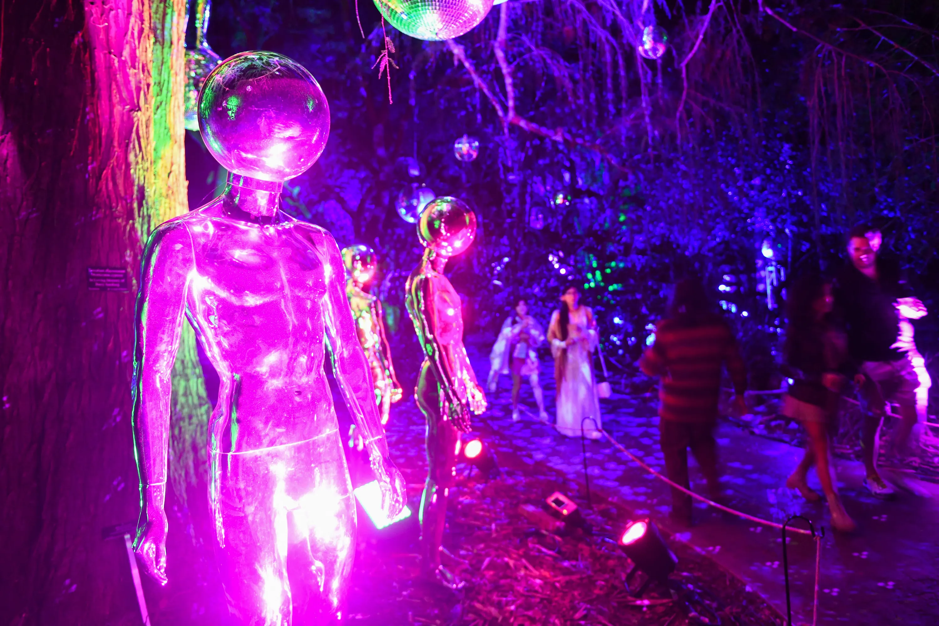 People walk through the Disko Tannsi area while visiting “Lightscape”, a light display at the Los Angeles County Arboretum and Botanic Garden on November 11, 2021 in Arcadia, California. The mile long pathway though The Arboretum features art installations of light, color, and sound immersed in the gardens. (Photo by Patrick T. Fallon/AFP Photo)