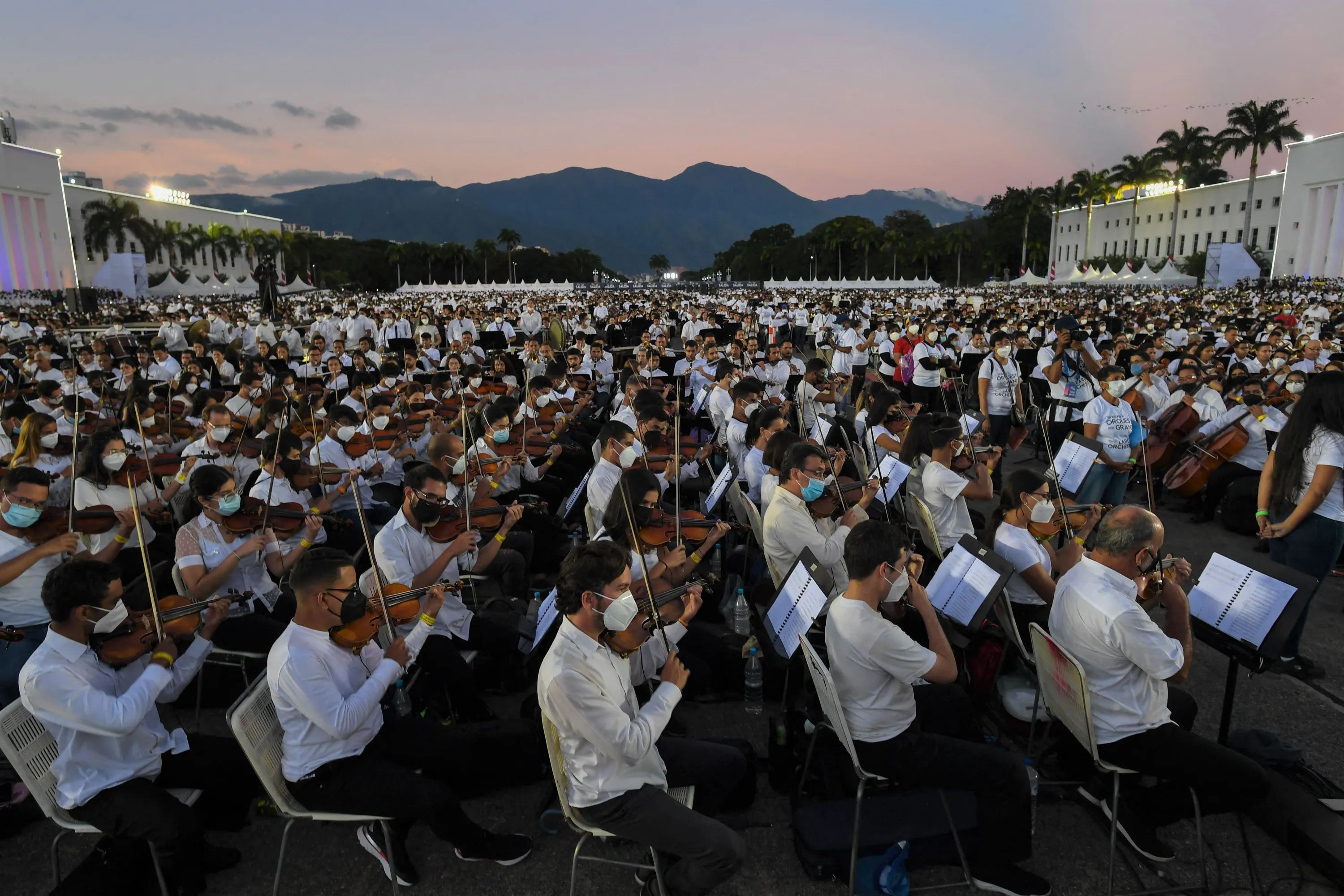 Members of the National System of Orchestras of Venezuela play during an attempt to enter the Guinness Book of Records for the largest orchestra in the world, with more than 12,000 musicians, at the Military Academy of the Bolivarian Army in Fuerte Tiuna Military Complex, in Caracas, on November 13, 2021. (Photo by Federico Parra/AFP Photo)