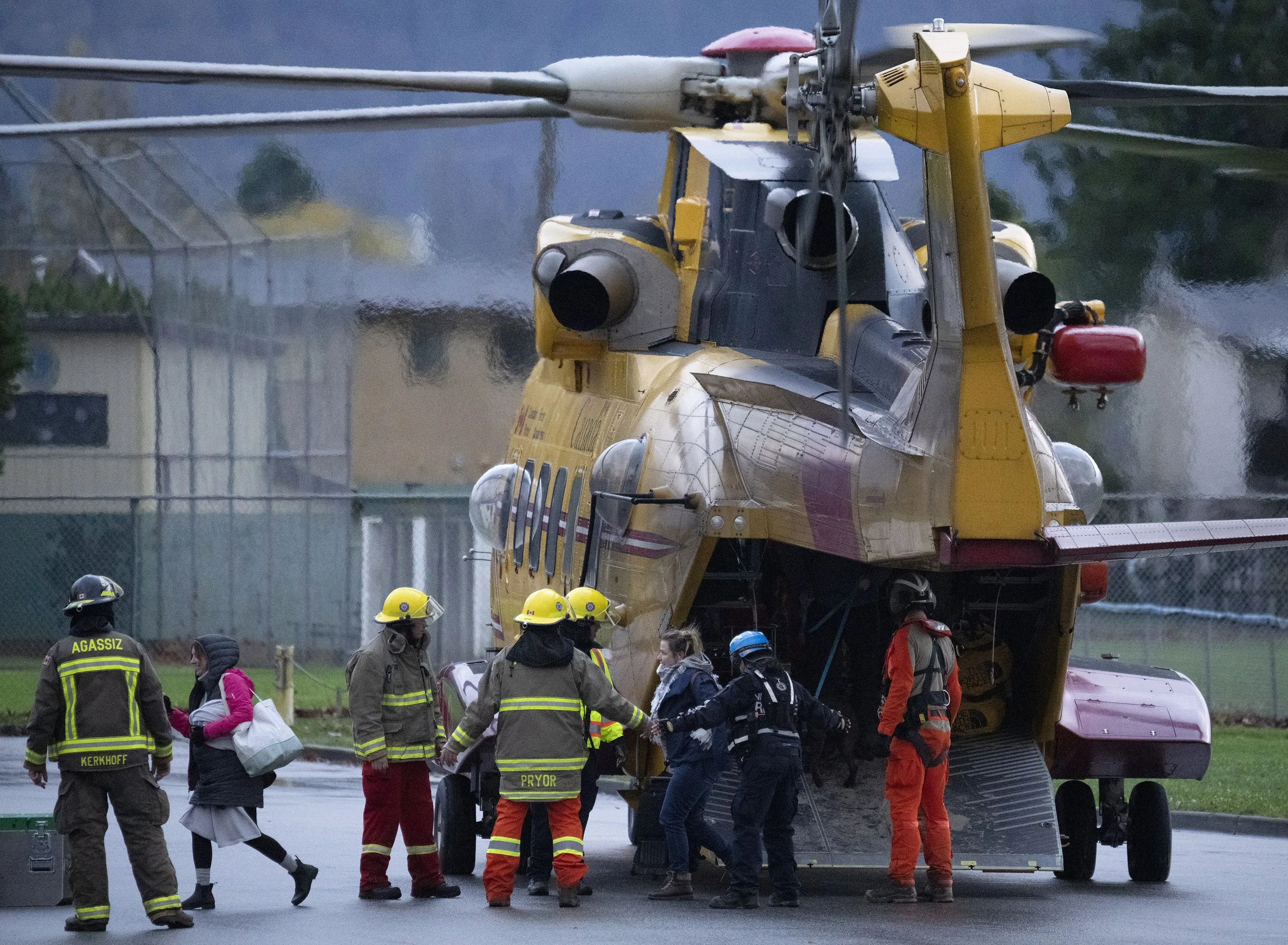 Search and rescue personnel help flood evacuees disembark from a helicopter in Agassiz, British Columbia, Monday, November 15, 2021. (Photo by Jonathan Hayward/The Canadian Press via AP Photo)