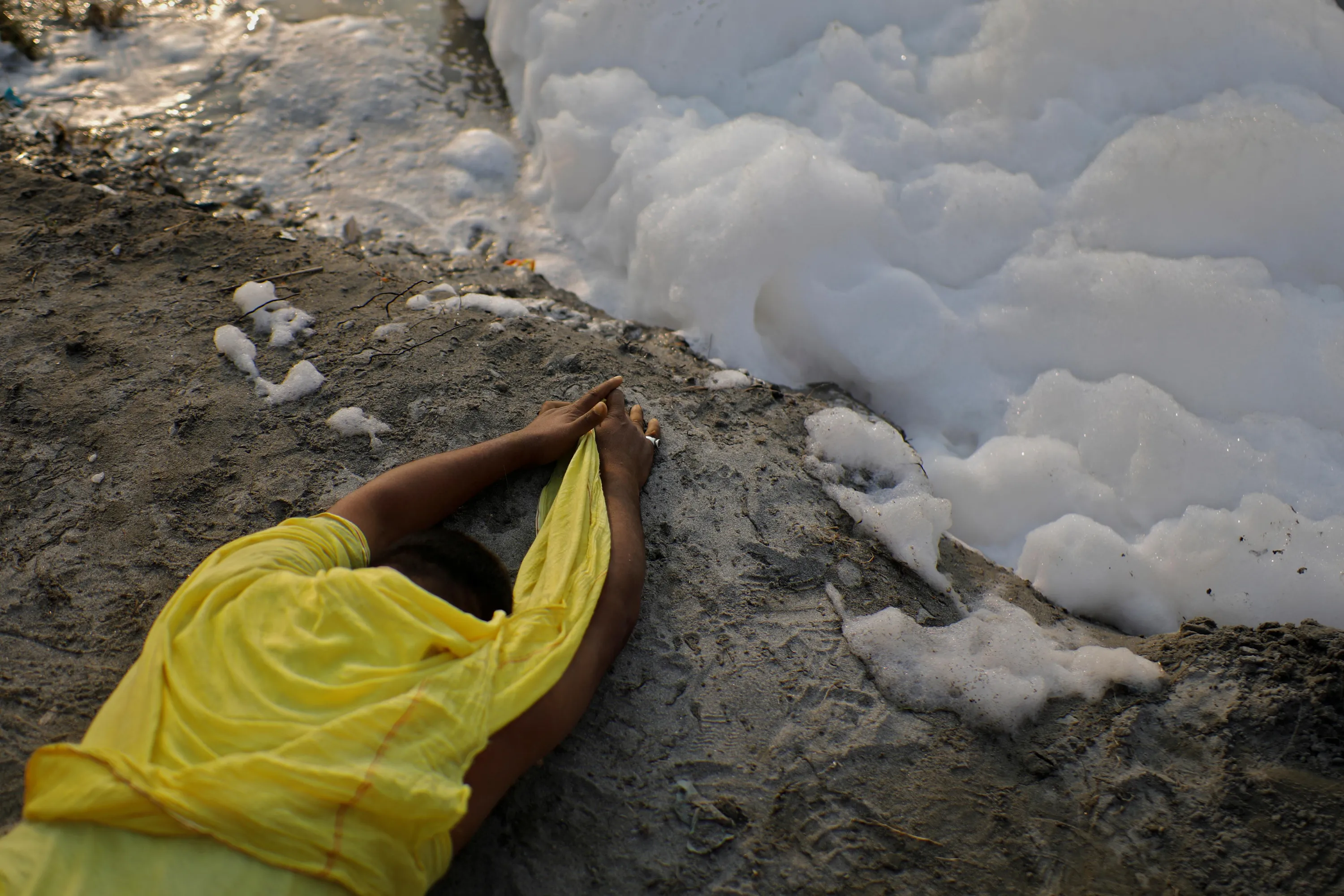 A Hindu devotee worship the Sun god next to the foam covering the polluted Yamuna river during the Hindu religious festival of Chhath Puja in New Delhi, India, November 10, 2021. (Photo by Adnan Abidi/Reuters)