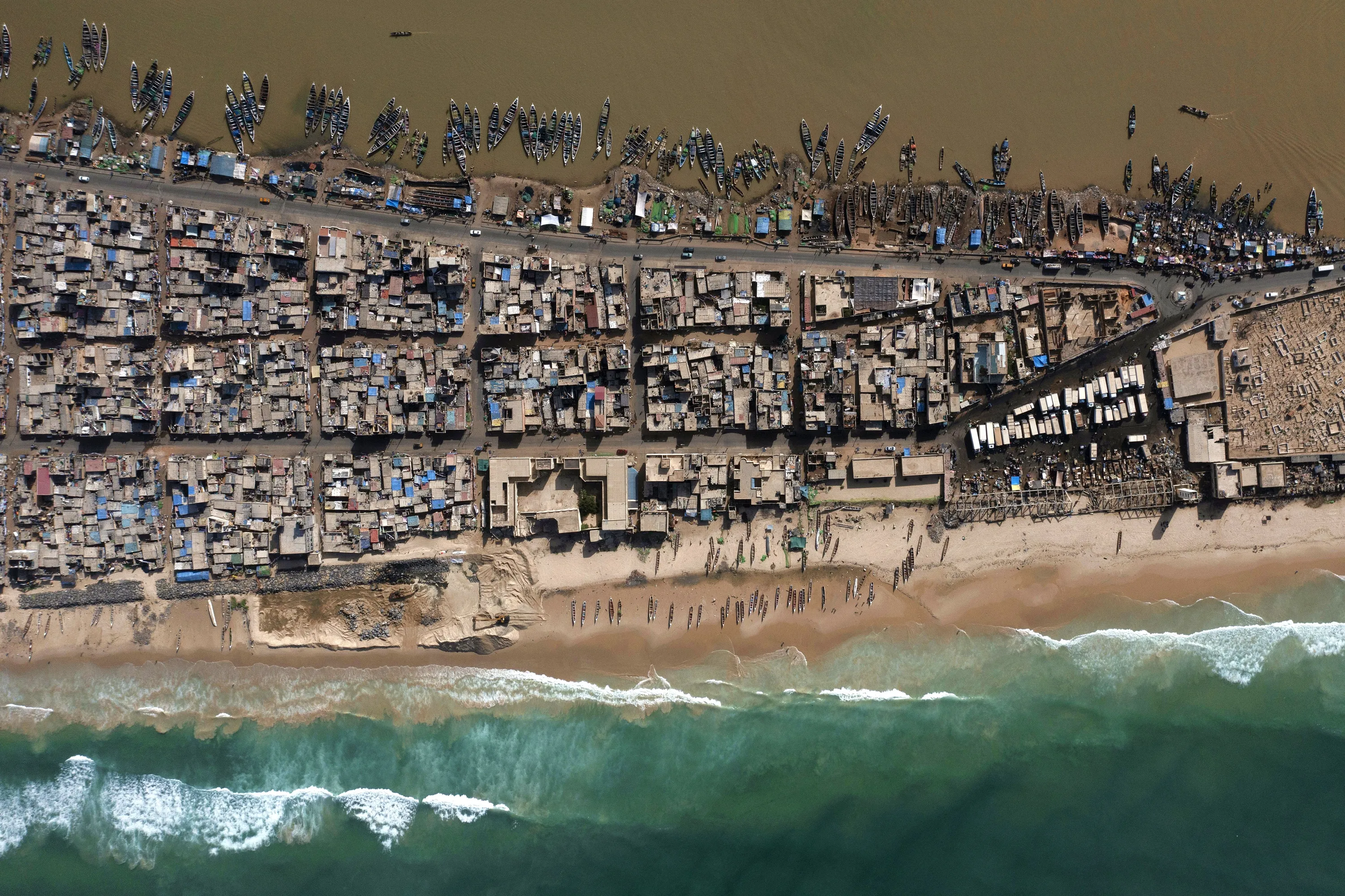 In this drone image, houses lay between the Senegal river, top, and the Atlantic Ocean beach that has been affected by erosion in Saint Louis, Senegal, Wednesday, November 3, 2021. World leaders are gathered in Scotland at a United Nations climate summit, known as COP26, to push nations to ratchet up their efforts to curb climate change. Experts say the amount of energy unleashed by planetary warming would melt much of the planet's ice, raise global sea levels and greatly increase the likelihood and extreme weather events. (Photo by Leo Correa/AP Photo)