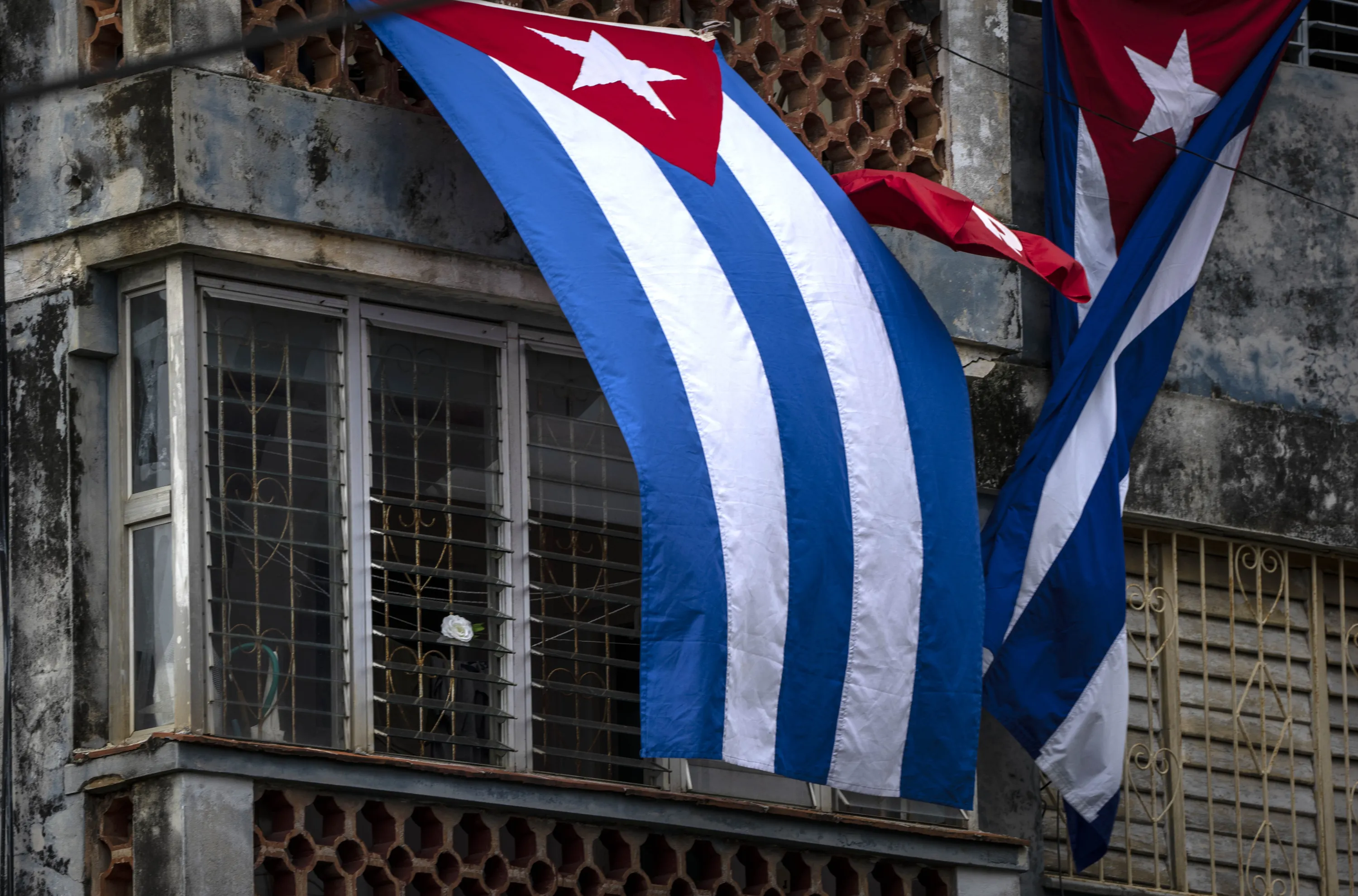Cuban flags drape the windows of the home of Yunior Garcia Aguilera, which block his windows and prevent his communicating with the outside, in Havana, Cuba, Monday, November 15, 2021. Garcia, one of the organizers of a banned opposition march, is a member of the internet debate forum Archipiélago which Cuban authorities considers illegal. (Photo by Ramon Espinosa/AP Photo)