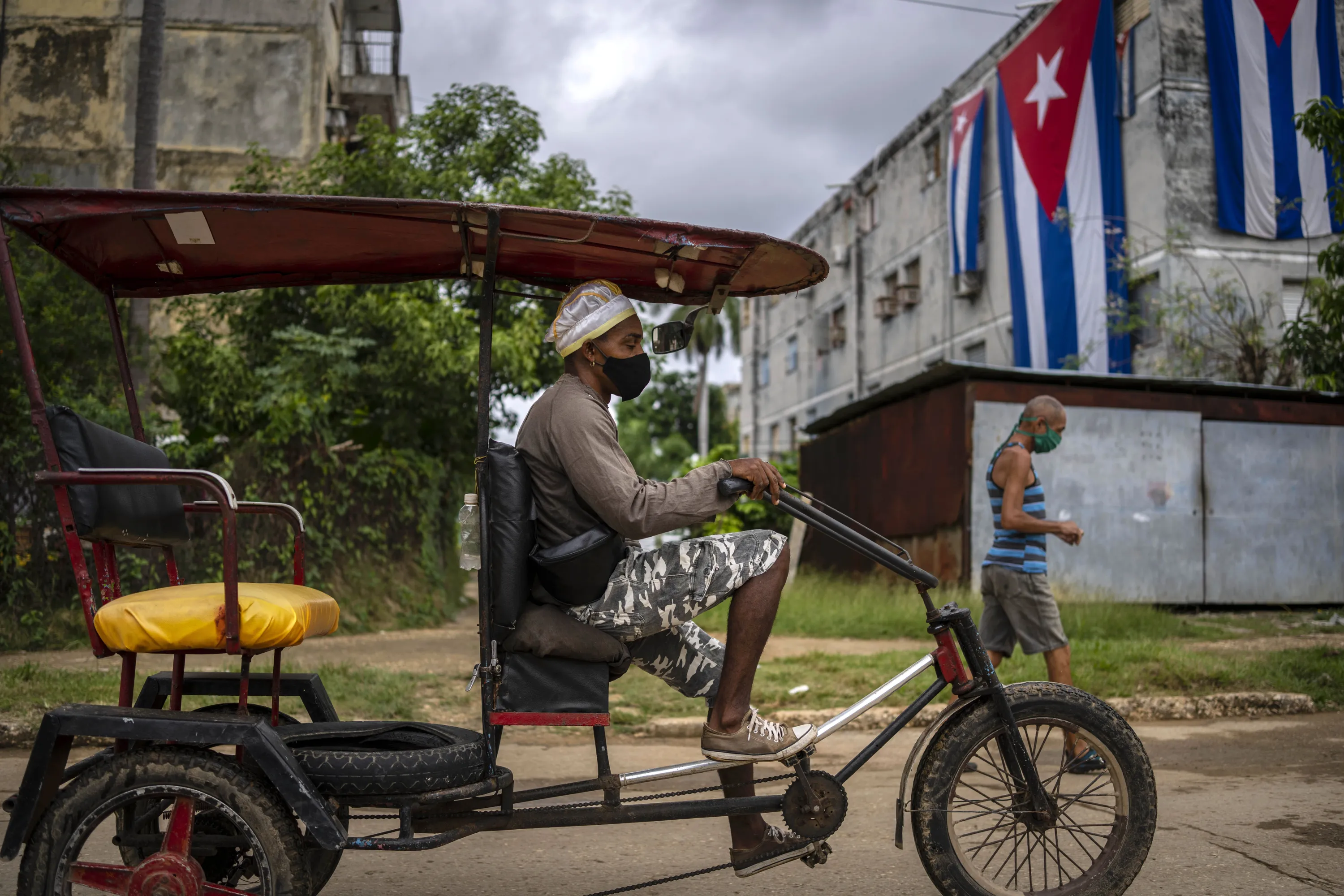 A bicycle taxi passes the home of Yunior Garcia Aguilera, one of the organizers of a banned opposition march, draped with Cuban flags as a way to block his windows and prevent his communicating with the outside in Havana, Cuba, Monday, November 15, 2021. Cuban authorities consider García's group Archipiélago, an internet debate forum, illegal. (Photo by Ramon Espinosa/AP Photo)
