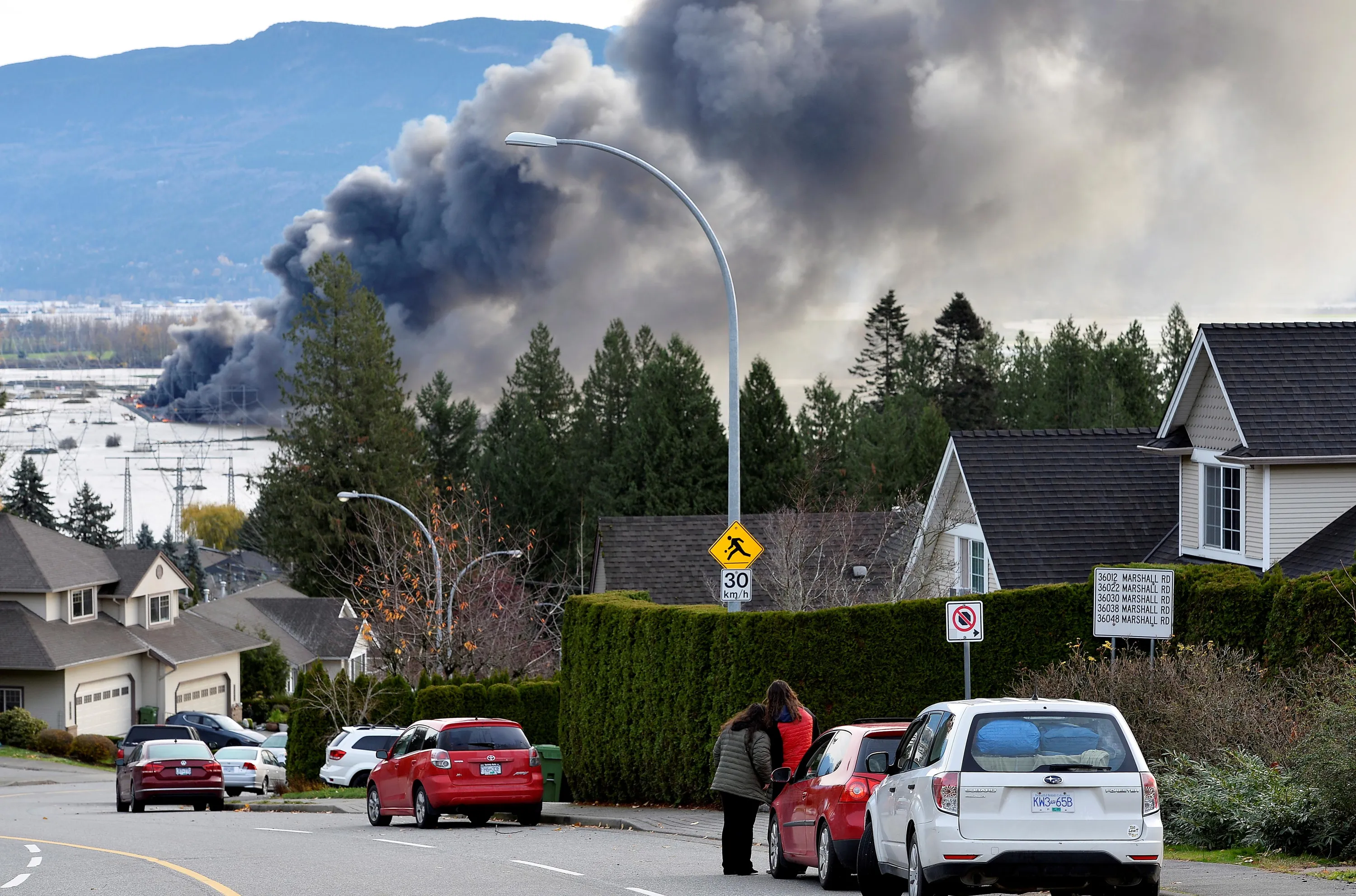 People watch as a fire burns at a RV storage lot, days after rainstorms lashed the western Canadian province of British Columbia, triggering landslides and floods, and shutting highways, in Abbotsford, British Columbia, Canada on November 17, 2021. (Photo by Jennifer Gauthier/Reuters)