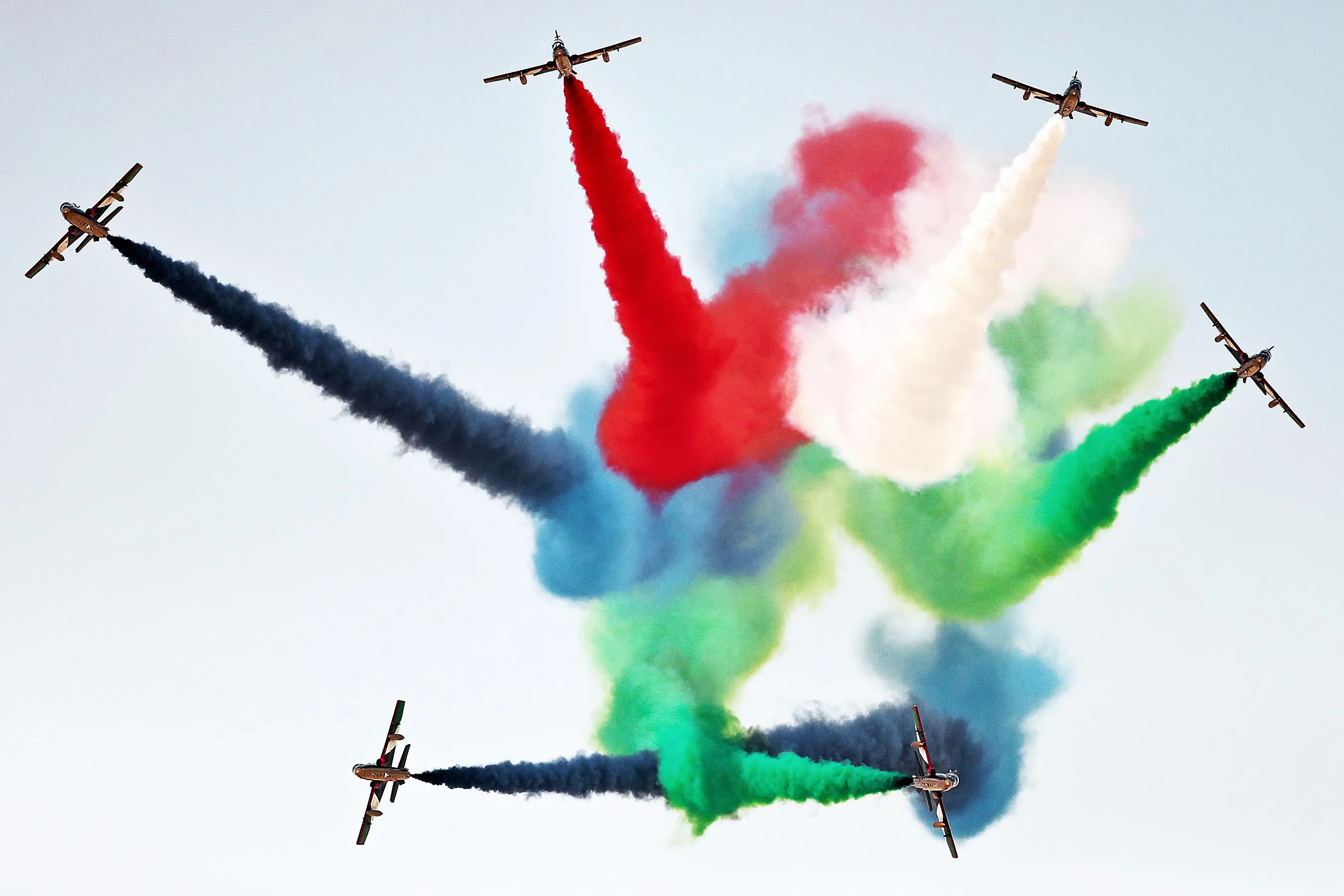 Members of Al Fursan aerobatics demonstration team of the United Arab Emirates (UAE) perform a fly over during the flying display at the Dubai Airshow 2021 at Dubai World Central – Al Maktoum International Airport, in Jebel Ali, Dubai, United Arab Emirates, 17 November 2021. (Photo by Ali Haider/EPA/EFE)