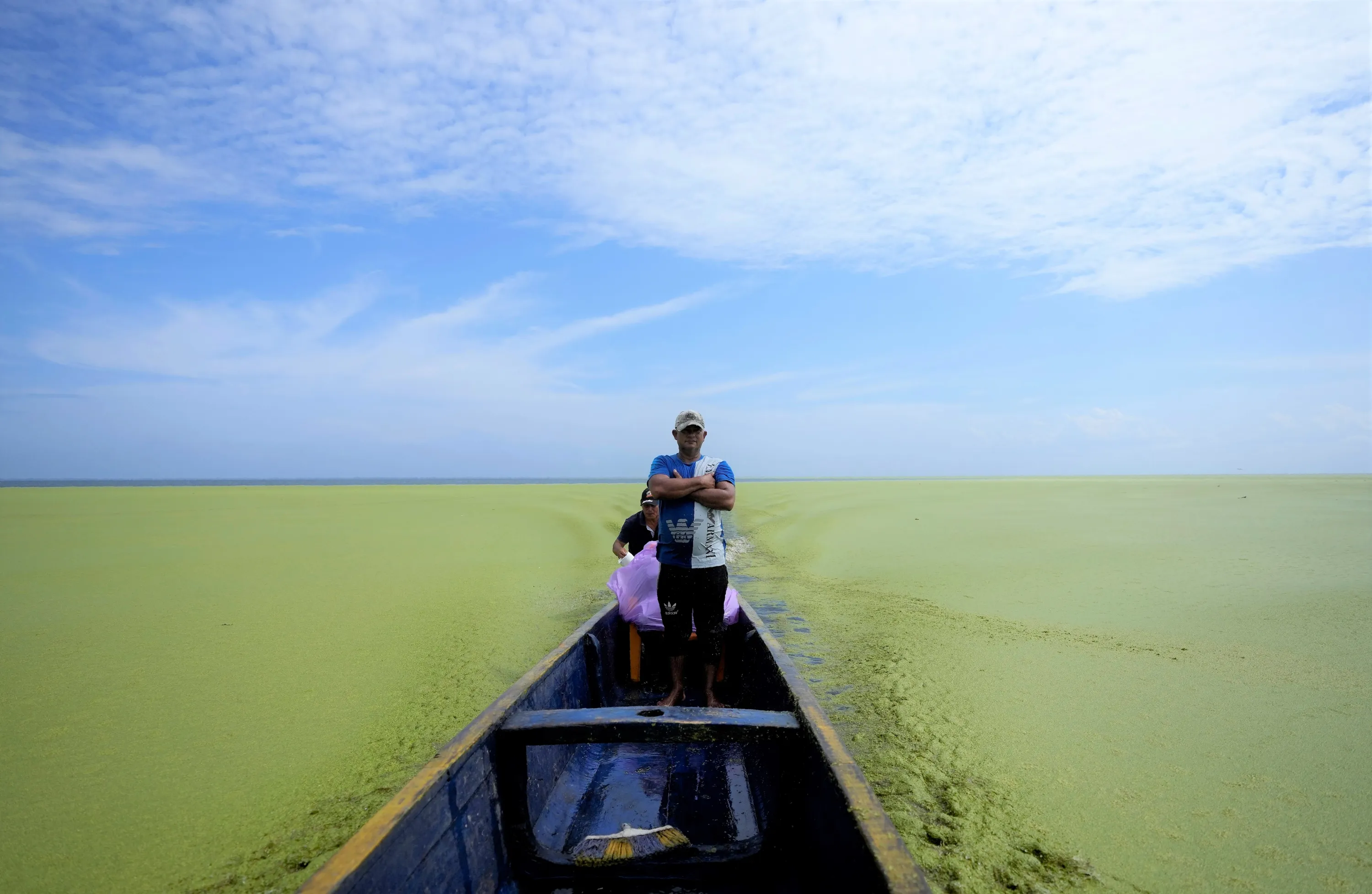 A fisherman stands on a boat at the Cienaga Grande de Santa Marta, in Nueva Venecia, Colombia, Tuesday, October 12, 2021. About 400 families live in stilt houses in the Cienaga Grande, which is the largest of the swampy marshes located in Colombia between the Magdalena River and the Sierra Nevada de Santa Marta mountains. (Photo by Fernando Vergara/AP Photo)