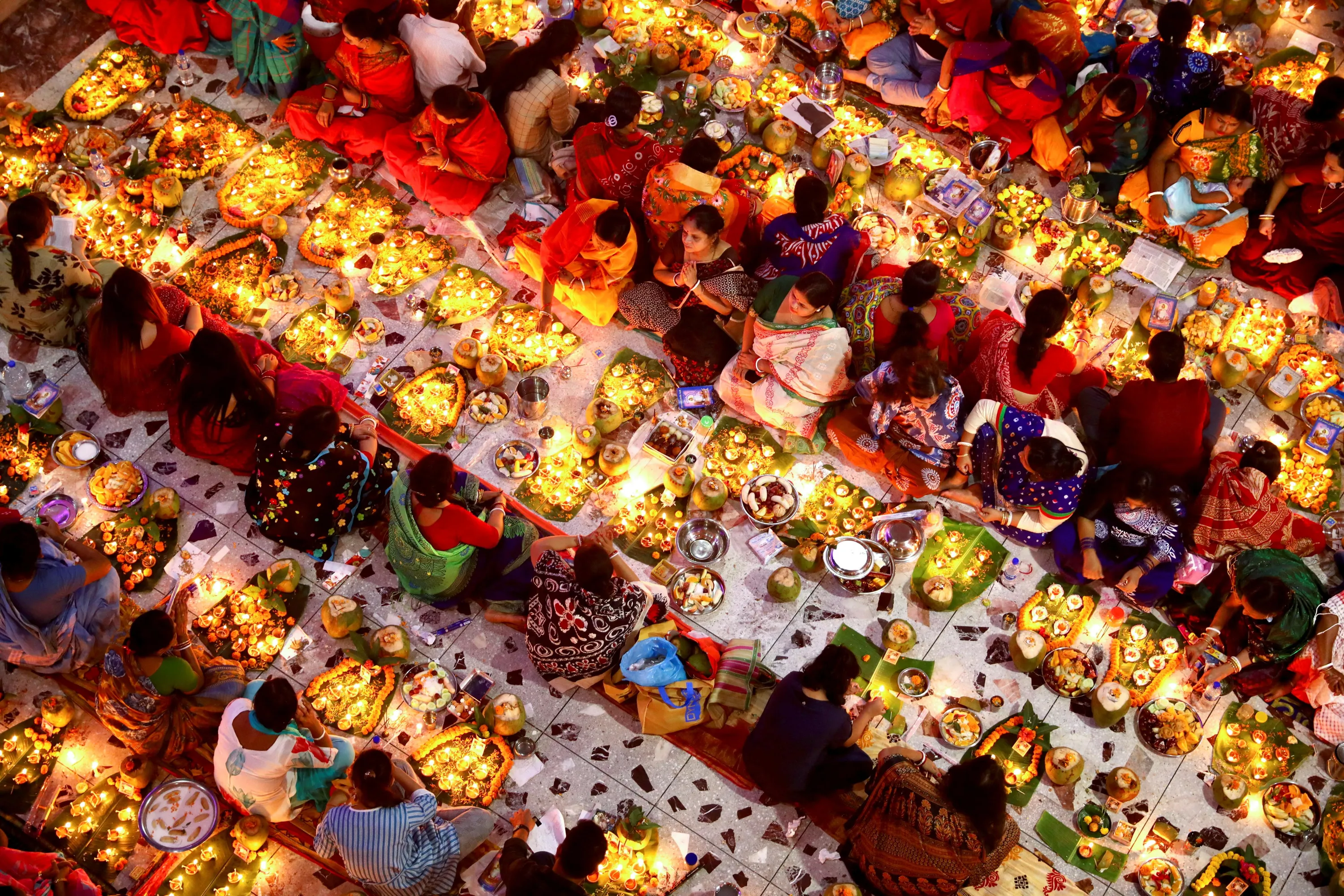 Hindu devotees sit together on the floor of a temple with oil lamps, praying to Lokenath Brahmachari, a Hindu saint, as they observe Rakher Upabash, in Dhaka, Bangladesh, November 9, 2021. (Photo by Mohammad Ponir Hossain/Reuters)