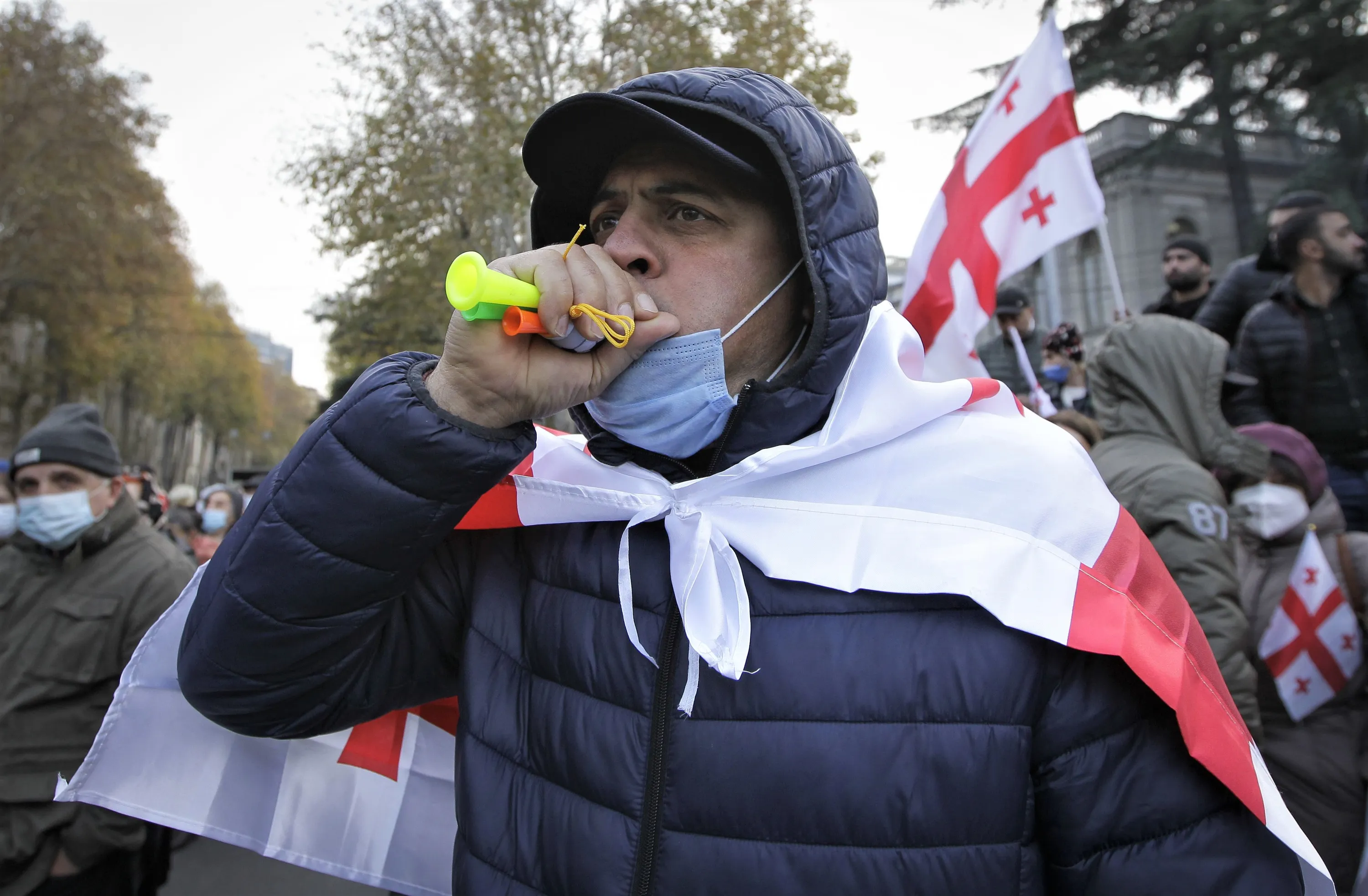 A demonstrators attends a rally in support of former President Mikheil Saakashvili in Tbilisi, Georgia, Friday, November 19, 2021. Several thousand people have rallied in the Georgian capital of Tbilisi, demanding that authorities in the ex-Soviet nation transfer the jailed ex-president to a civilian hospital amid reports that his health is deteriorating after weeks of being on a hunger strike. (Photo by Shakh Aivazov/AP Photo)