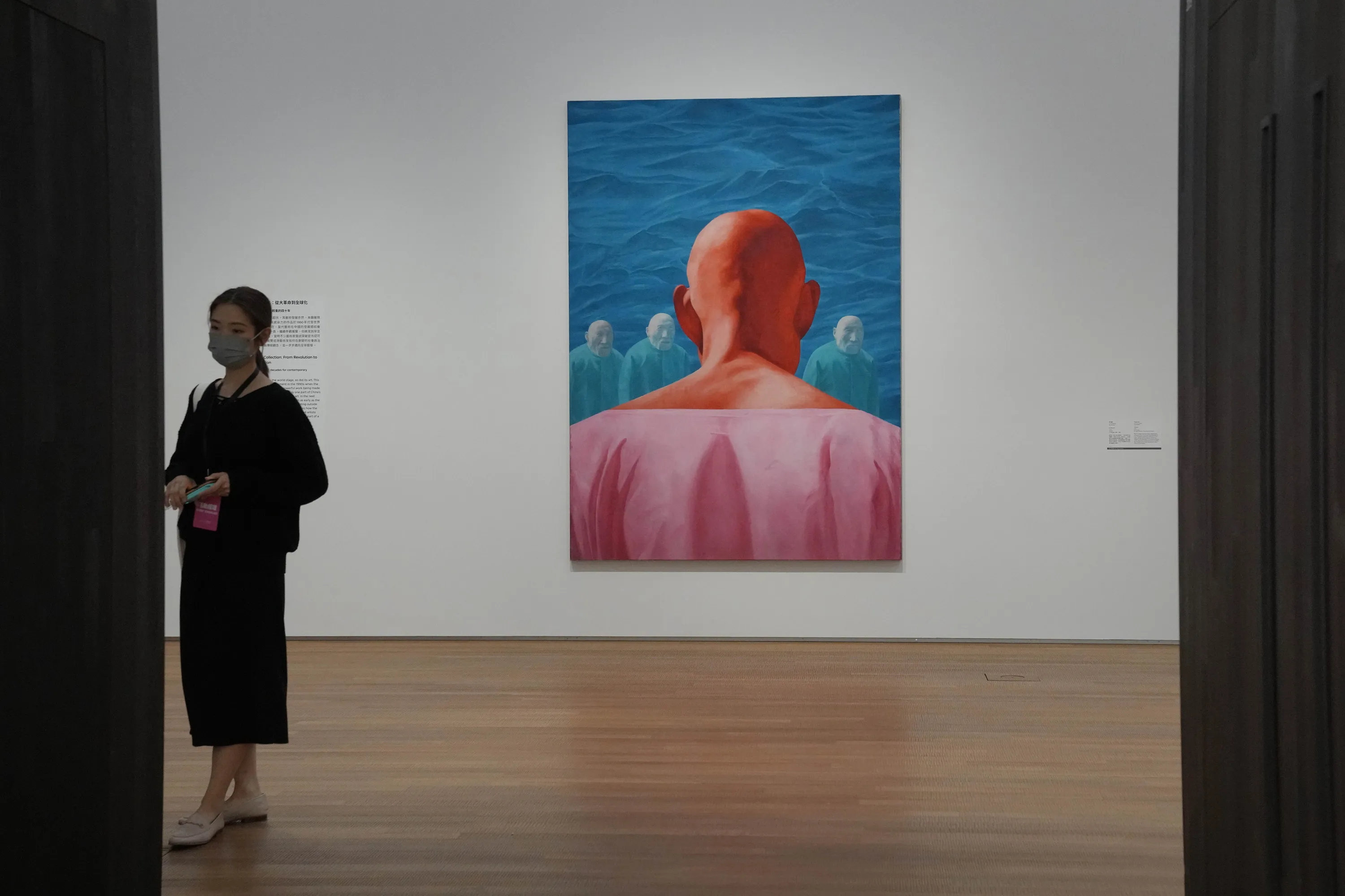 A woman walks past the artwork “1995.2” created by Chinese artist Fang Lijun during a media preview in the West Kowloon Cultural District of Hong Kong, Thursday, November 11, 2021. (Photo by Kin Cheung/AP Photo)