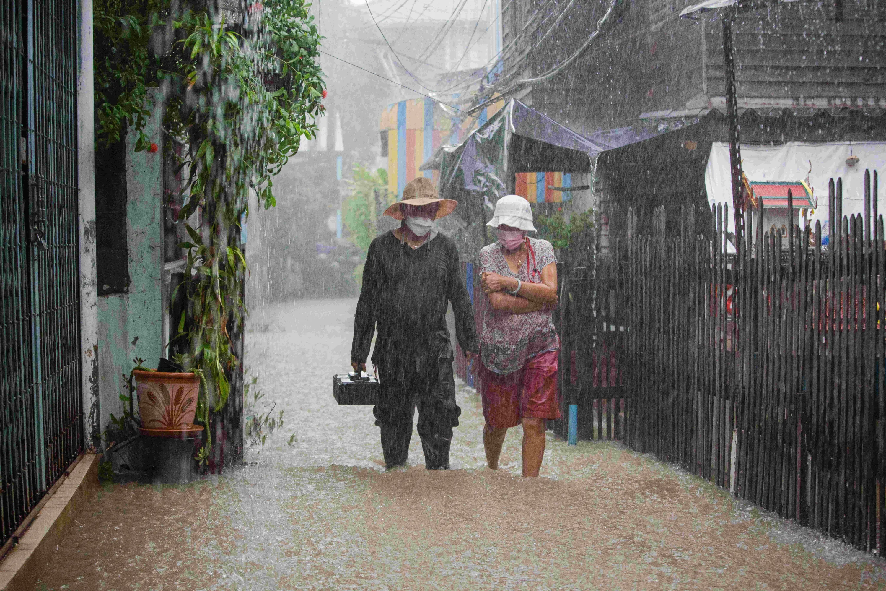 Koh Kret residents walk through a submerged alley during a heavy rainfall in Thailand on October 3, 2021. Twenty provinces have been affected by the Dianmu storm. Each day the riverside communities in Nonthaburi face renewed flooding. (Photo by Varuth Pongsapipatt/SOPA Images/LightRocket via Getty Images)