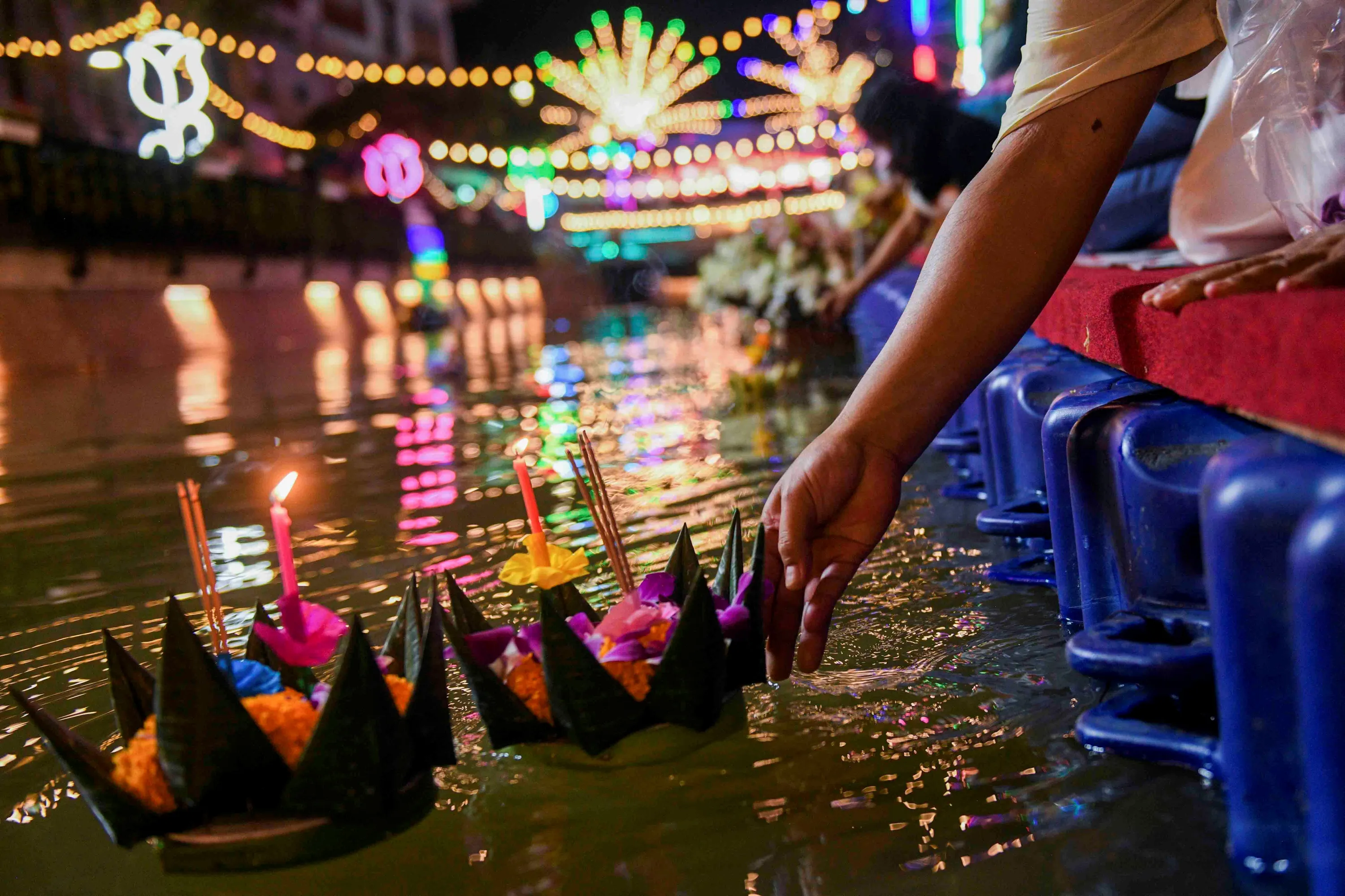 People gather to place krathongs (floating baskets) into a canal during the Loy Krathong festival, which is held as a symbolic apology to the goddess of the river in Bangkok, Thailand, November 19, 2021. (Photo by Chalinee Thirasupa/Reuters)