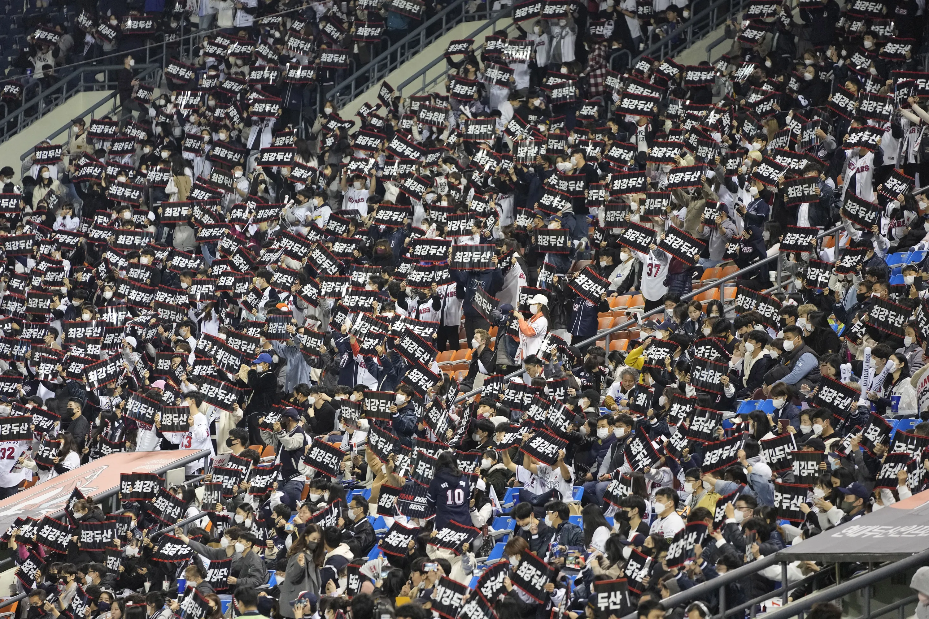 Baseball fans who are fully vaccinated or tested negative for the virus within the last 48 hours or under 18 years old, cheer their teams during the wildcard baseball game for the KBO postseason between Kiwoom Heroes and Doosan Bears in Seoul, South Korea, Monday, November 1, 2021. South Korea on Monday began to allow larger social gatherings and lifted business-hour restrictions on restaurants in what officials described as the first step toward attempting to restore some pre-pandemic normalcy. (Photo by Lee Jin-man/AP Photo)