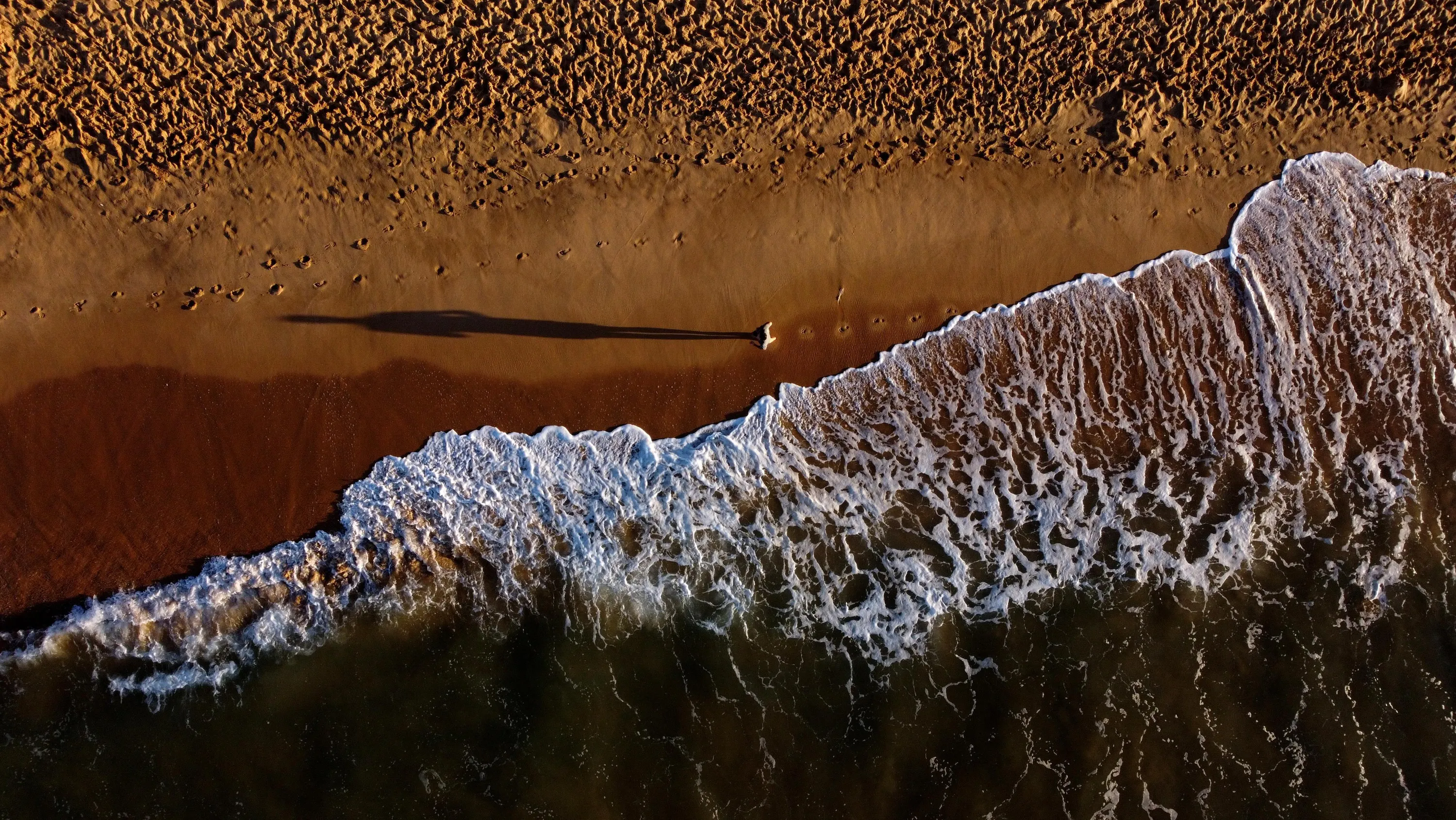 A person runs along the beach in Olhos de Agua, Albufeira, Portugal, October 28, 2021. Picture taken with a drone. (Photo by Carl Recine/Reuters)