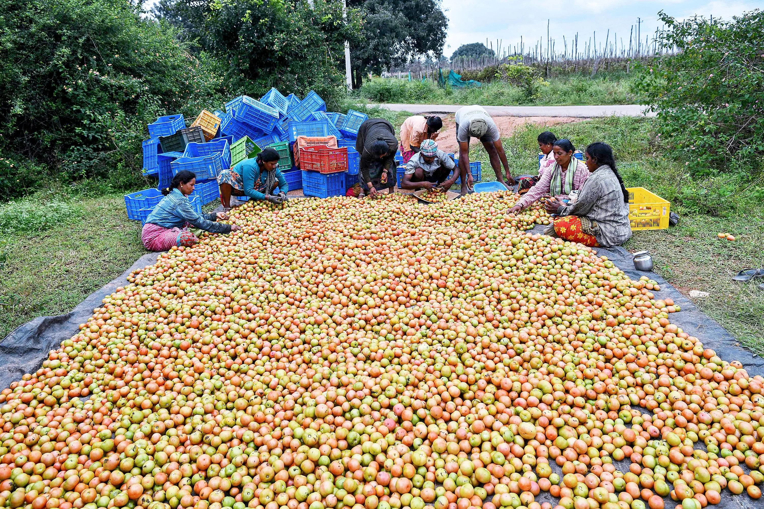 Farmers and agriculture labourers sort harvested tomatoes on the outskirts of Bangalore on November 17, 2021. (Photo by Manjunath Kiran/AFP Photo)