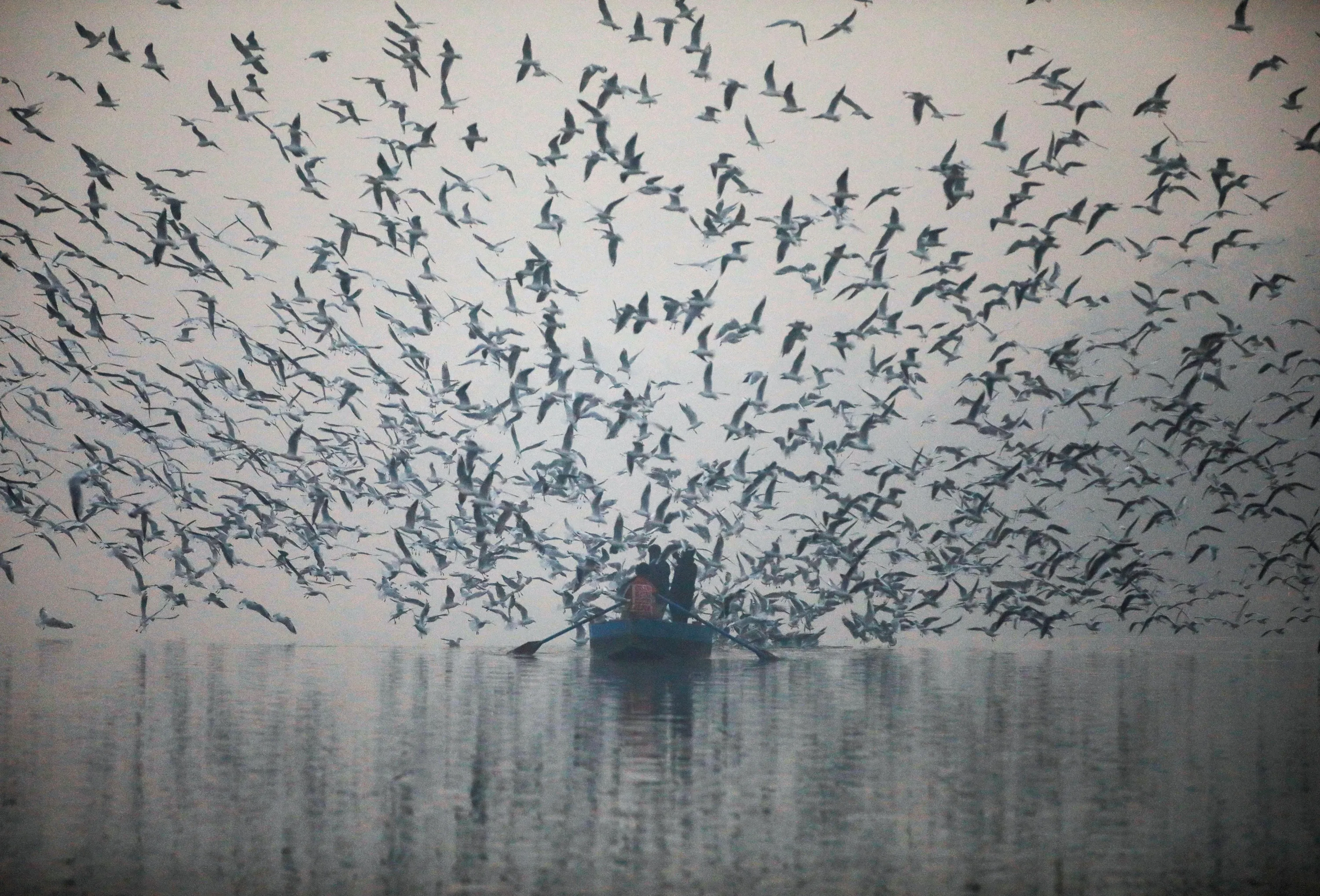 People feed seagulls from a boat at Yamuna river, on a smoggy morning in New Delhi, India November 18, 2021. (Photo by Navesh Chitrakar/Reuters)