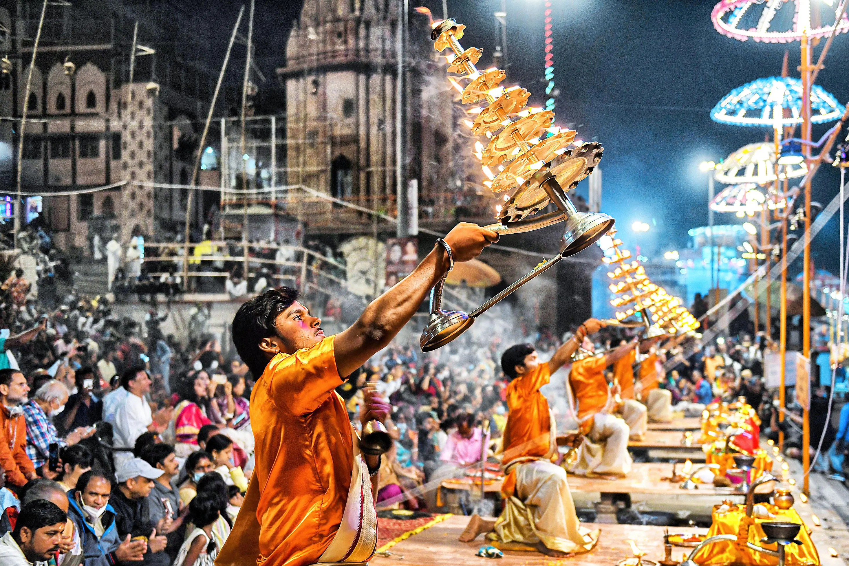 Hindu Priests performing Evening Aarati (Prayer) at Dashashwamedh Ghat on November 17, 2021, during the Ganga Aarti, a traditional and old Hindu ritual honouring the Ganges River which is held at the Banks of the river. (Photo by Avishek Das/SOPA Images/Rex Features/Shutterstock)