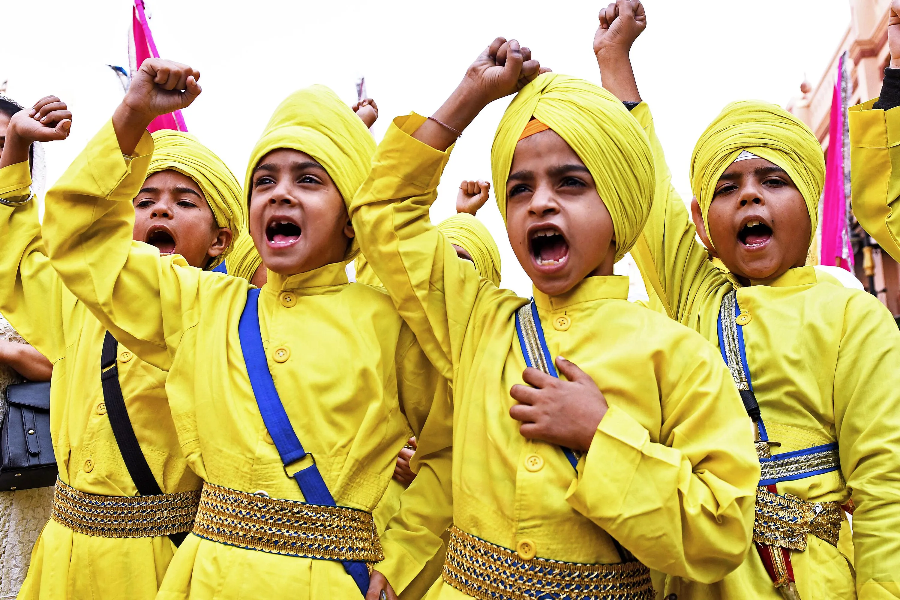 Children take part in the “Nagar Kirtan” procession on the eve of the birth anniversary of Guru Nanak Dev, the founder of Sikhism, at the Golden Temple in Amritsar on November 18, 2021. (Photo by Narinder Nanu/AFP Photo)