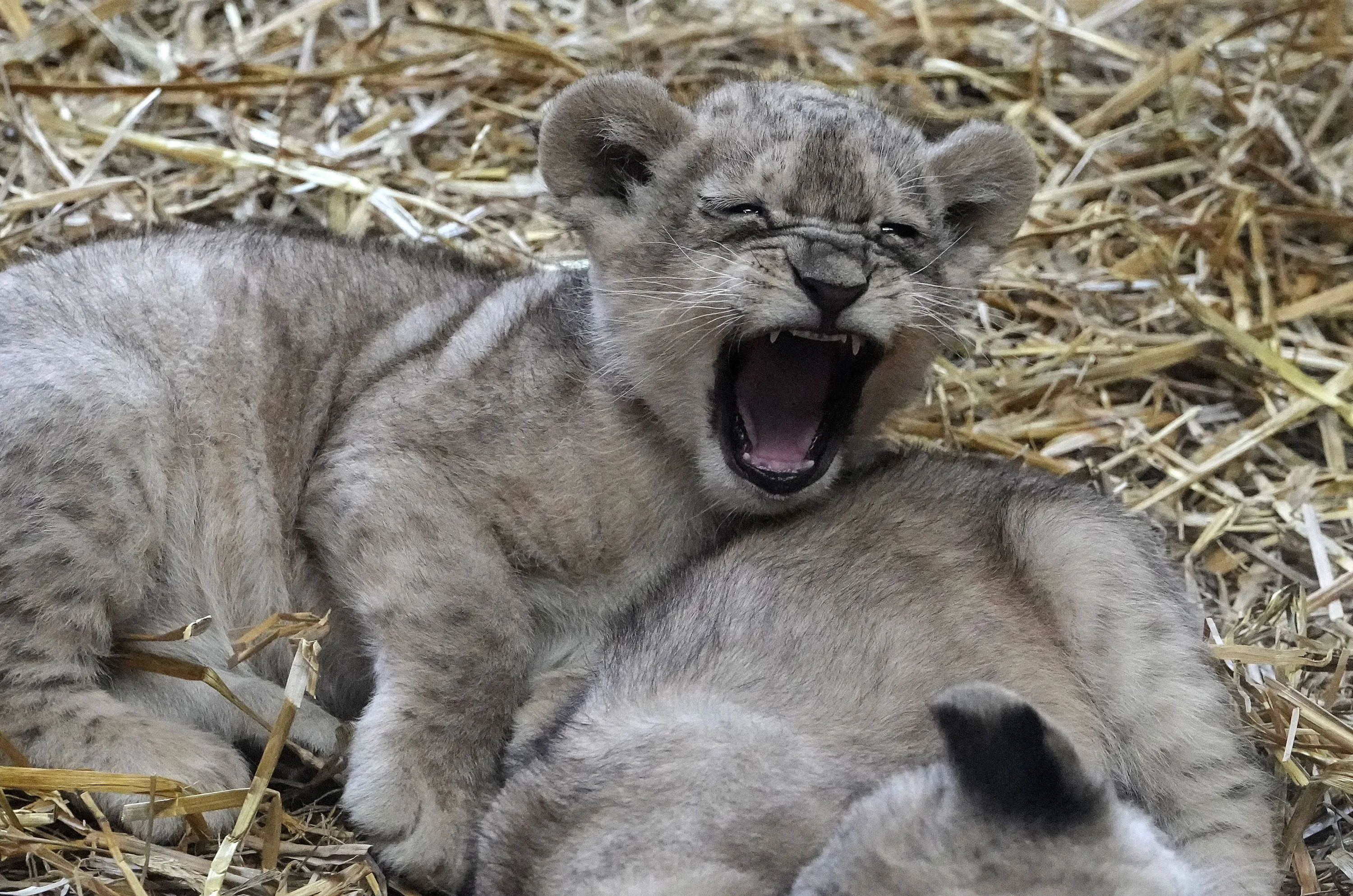 The little tired lion cub Kumani yawns beside her sisters Jamila and Malaika at the fist day at their open to the public enclosure at the Zoo in Gelsenkirchen, Germany, Monday, November 15, 2021. The triple lion offspring was born 5 weeks ago. (Photo by Martin Meissner/AP Photo)