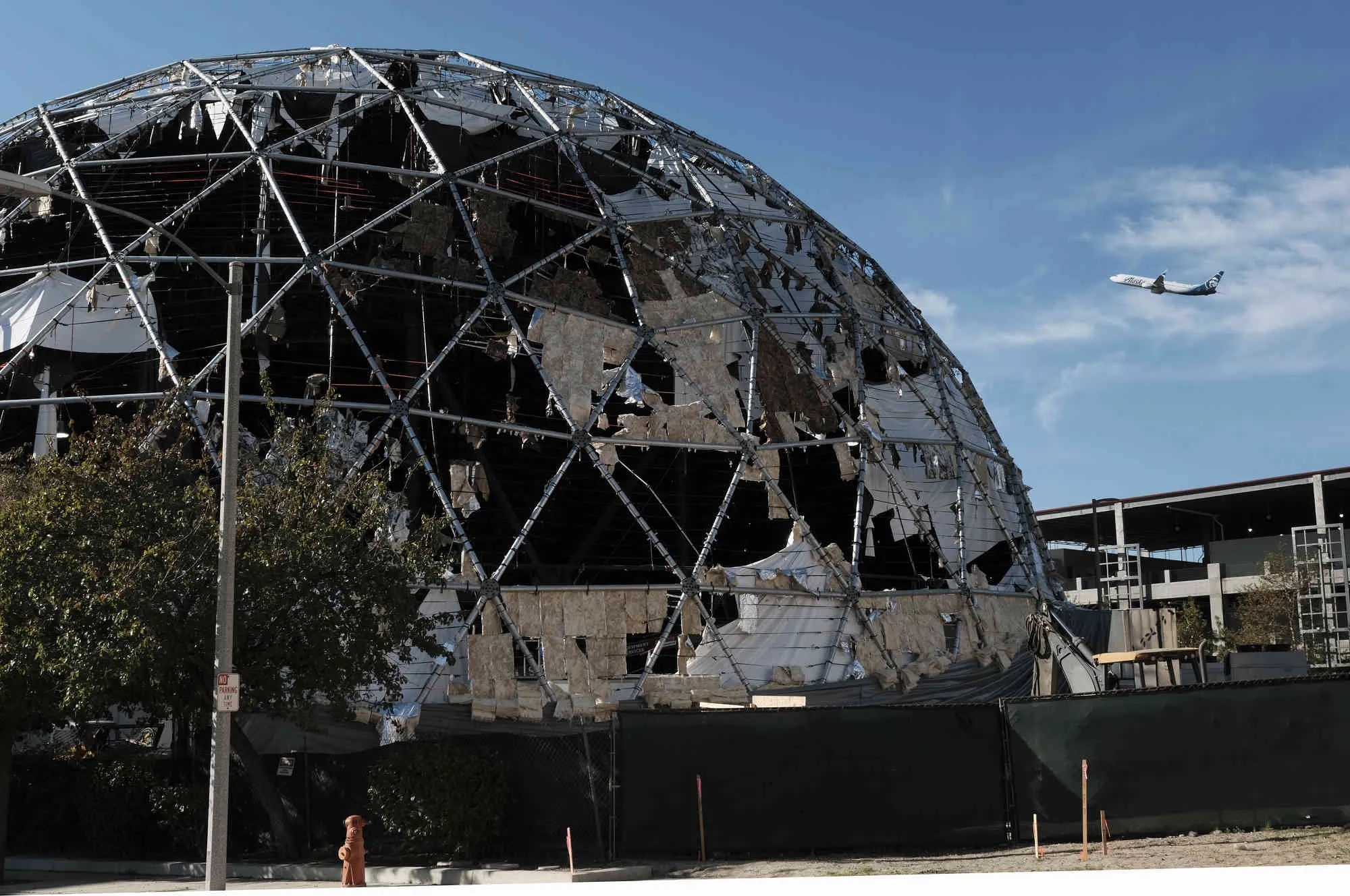 A large dome used as a studio production facility near the Burbank Airport is shredded from strong winds that passed through the area on Friday, November 26, 2021 in Burbank, Calif. Santa Ana winds were declining in strength Friday but thousands of Southern California utility customers remained without electricity due to intentional power shutoffs intended to prevent wildfires. (Photo by Richard Vogel/AP Photo)