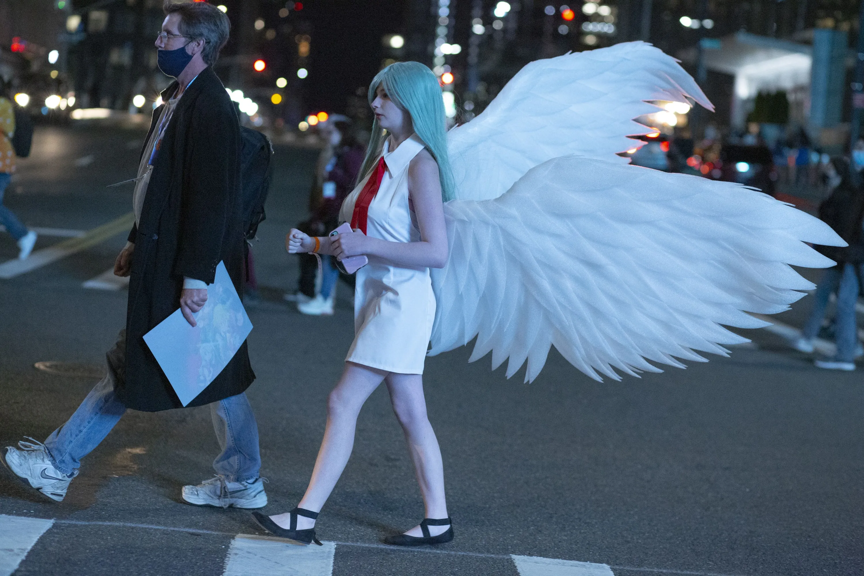 A cosplayer leaves Anime NYC at the Jacob K. Javits Convention Center in New York City on November 20, 2021. Anime NYC is an annual three-day anime convention held during in New York City. (Photo by Kena Betancur/AFP Photo)