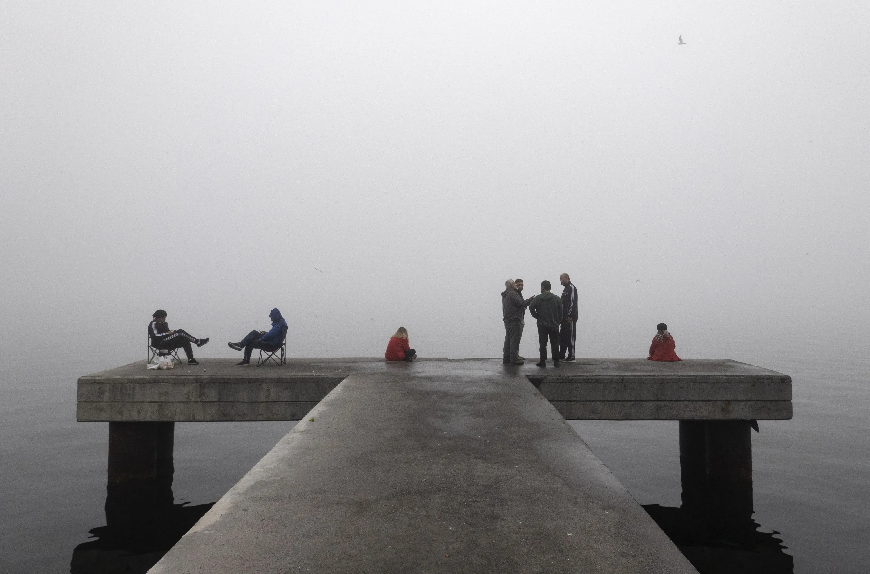 People on a pier near the Bosphorus on a foggy day in Istanbul, Turkey, 06 November 2021. (Photo by Erdem Sahin/EPA/EFE)