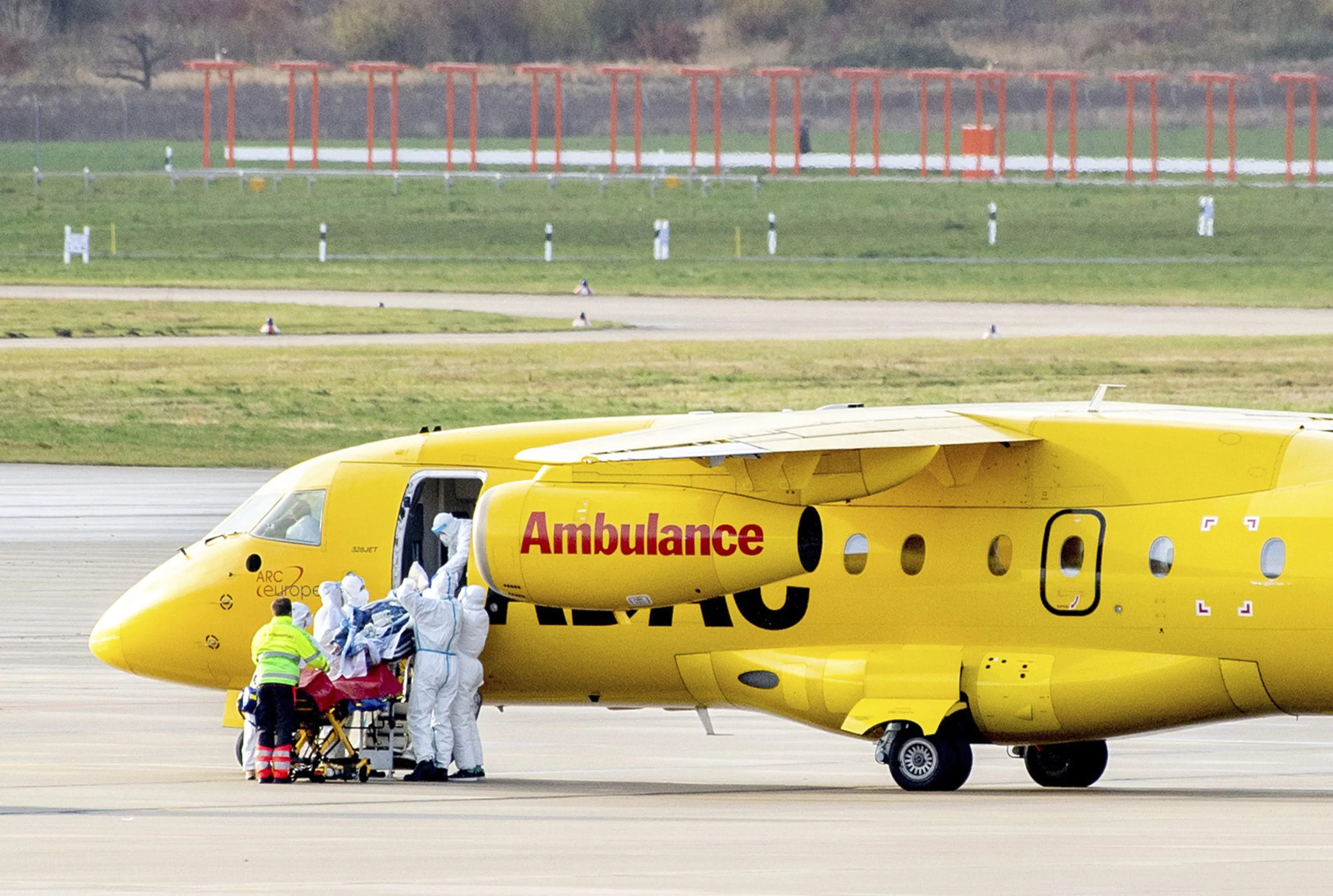 One of two Covid 19 patients is unloaded from a Dornier 328Jet ADAC aircraft by rescue workers at Hanover airport for transfer to hospital by intensive care transport in Langenhagen, Germany, Tuesday, November 30, 2021. Seriously ill patients from intensive care units in Bavaria, Thuringia and Saxony are being transported to areas in the north and west of Germany that are currently less severely affected as part of the “cloverleaf” mechanism coordinated between the federal and state governments throughout Germany. (Photo by Hauke-Christian Dittrich/dpa via AP Photo)