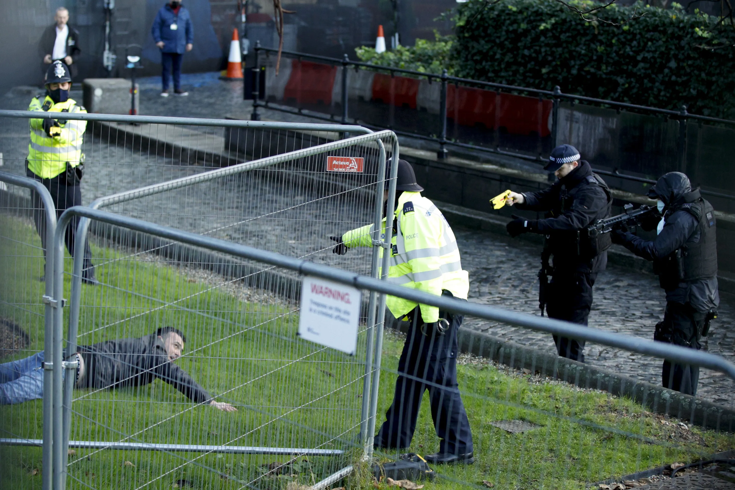 Police officers detain a man after he entered the grounds of the Houses of Parliament in London, Wednesday, December 1, 2021. (Photo by David Cliff/AP Photo)