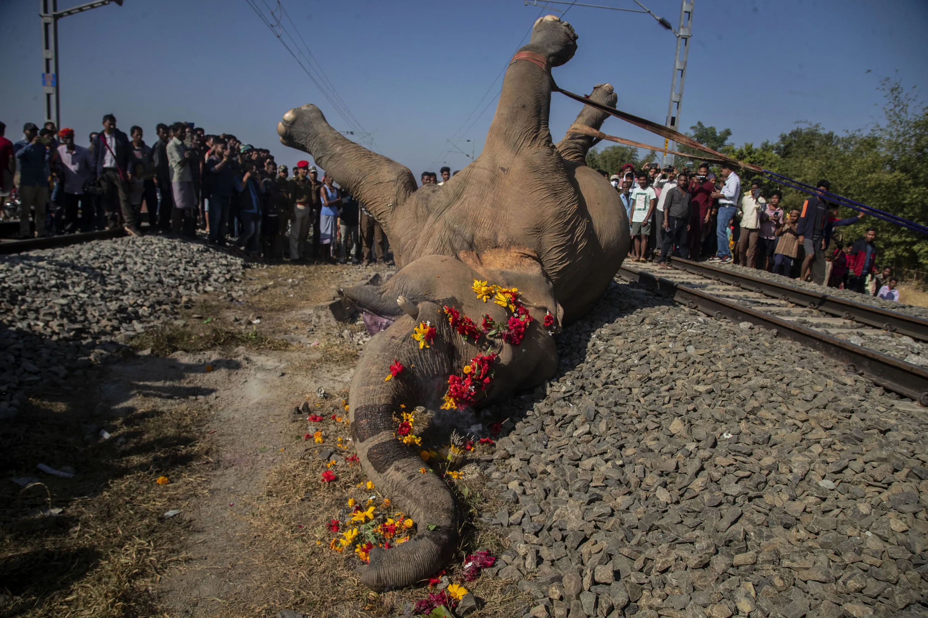 An excavator lifts a wild male elephant, one of two killed by a train in Durung Pathar, in the northeastern Indian state of Assam, Wednesday, December 1, 2021. Speeding trains have run down dozens of wild elephants in Assam in the past, forcing the Indian Railways, which runs the trains, to regulate speed in known elephant corridors. Assam, which has a history of man-elephant conflict, has an estimated 5,000 wild Asiatic elephants. (Photo by Anupam Nath/AP Photo)