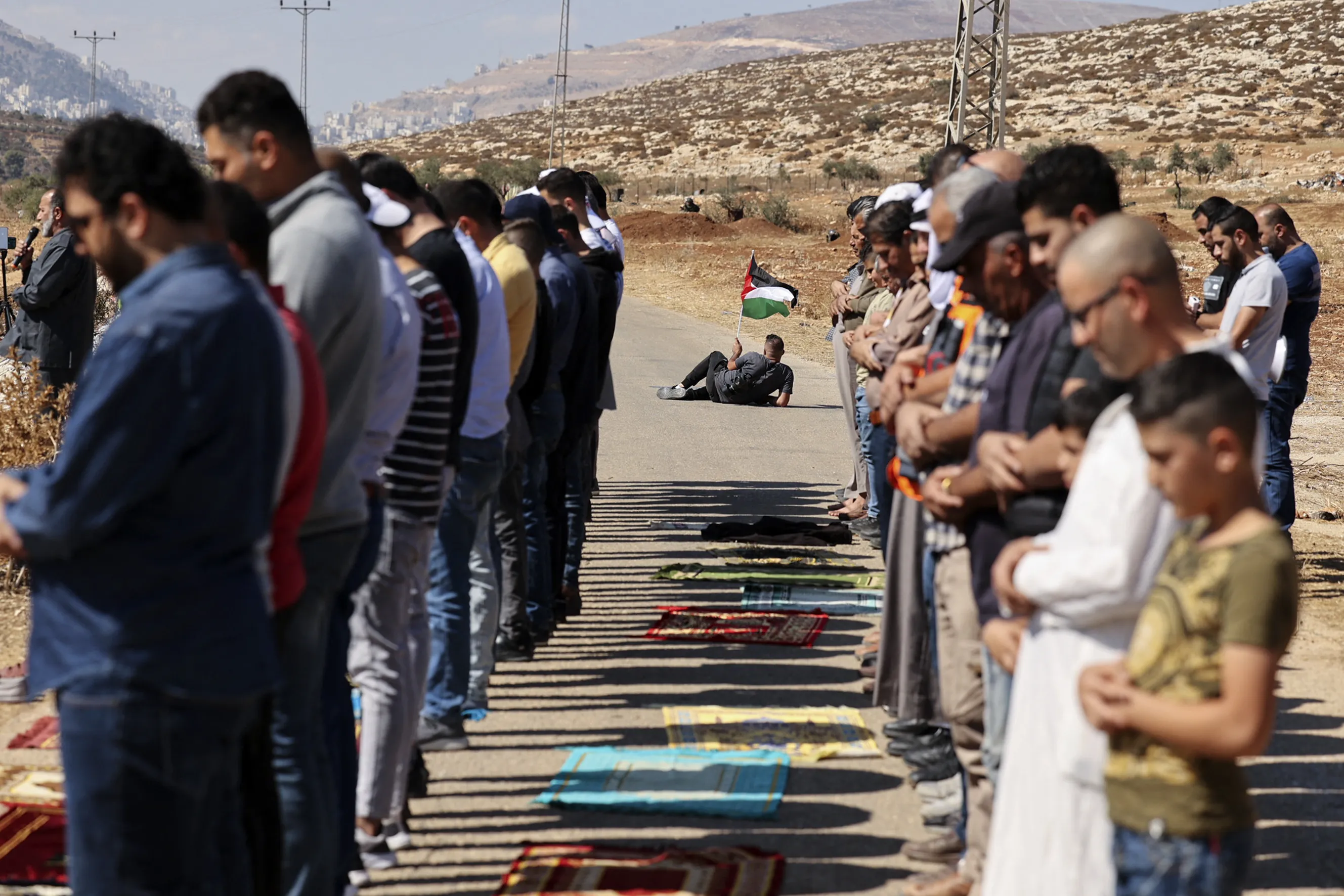 A Palestinian protester waves a national flag, as others proform the Friday prayers during a demonstration against the establishment of Israeli outposts on their lands, in Beit Dajan, east of Nablus in the Israeli-occupied West Bank, on October 22, 2021. (Photo by Abbas Momani/AFP Photo)