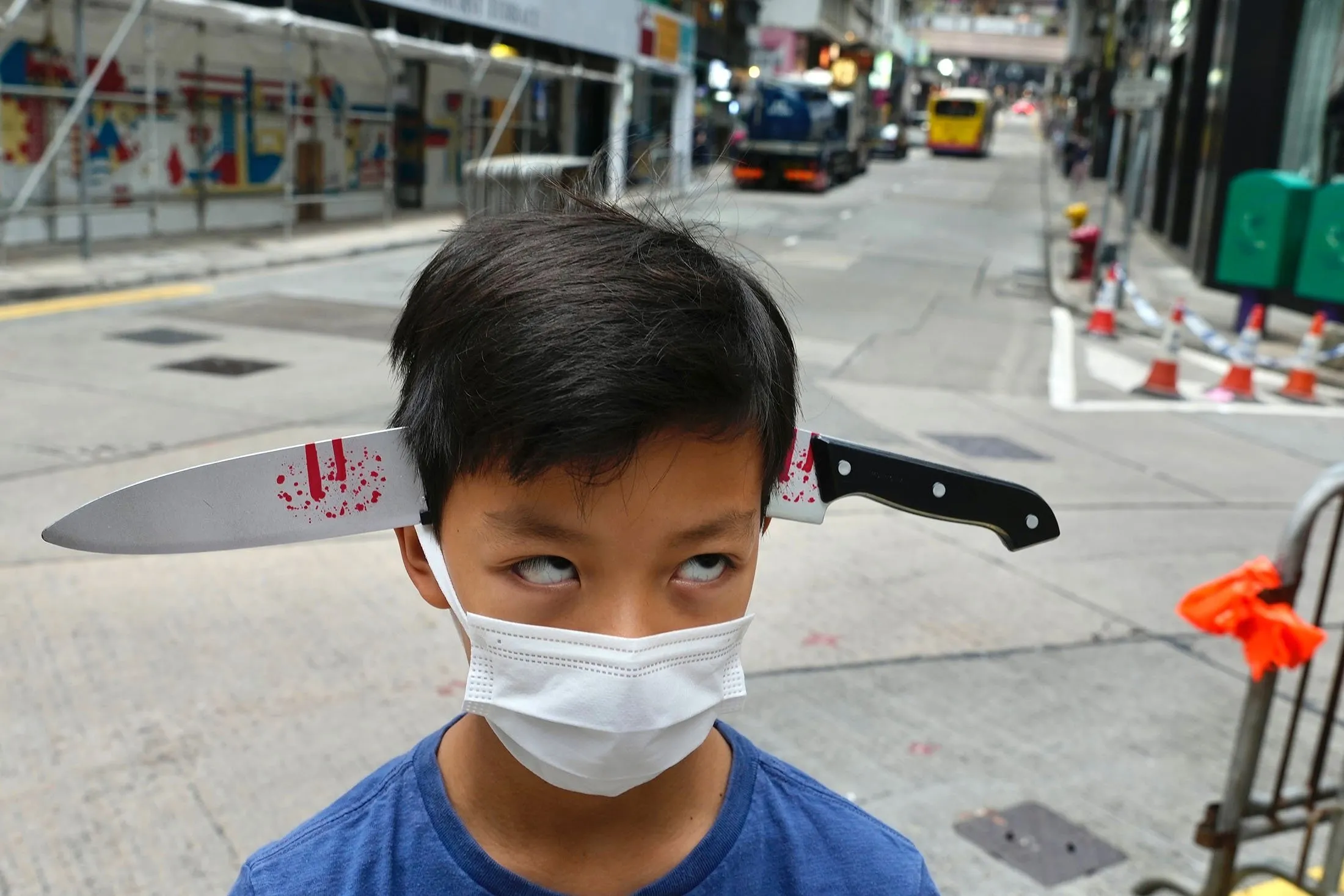 A boy wears a plastic toy knife as he celebrates Halloween in Hong Kong, Sunday, October 31, 2021. (Photo by Vincent Yu/AP Photo)
