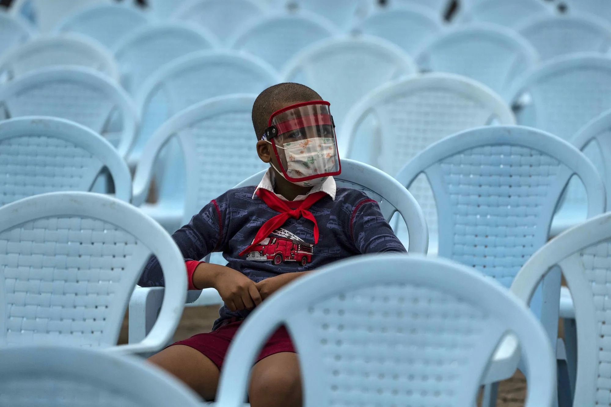 A student wearing a mask as a precaution amid the spread of COVID-19 wait during the official opening ceremony of the school year in Havana, Cuba, Monday, November 15, 2021. After 20 months of strict quarantine rules that included limiting foreign travel to the island, Cuba today reopens to the world. Airports, hotels, businesses and the remaining half of the student population resume activities. (Photo by Ramon Epinosa/AP Photo)