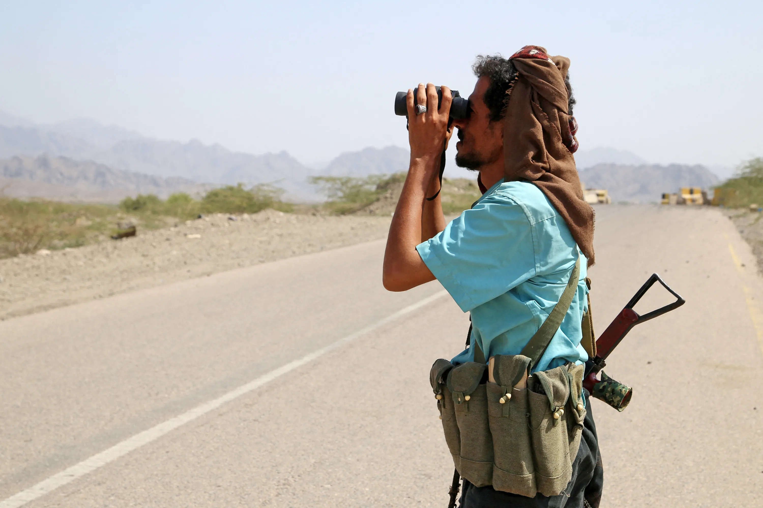 A fighter loyal to Yemen's Saudi-backed government looks through his binoculars near al-Jawba frontline, facing Iran-backed Huthi rebels, in the village of Hays, near the conflict zone in Yemen's western province of Hodeida, on November 21, 2021. (Photo by Khaled Ziad/AFP Photo)