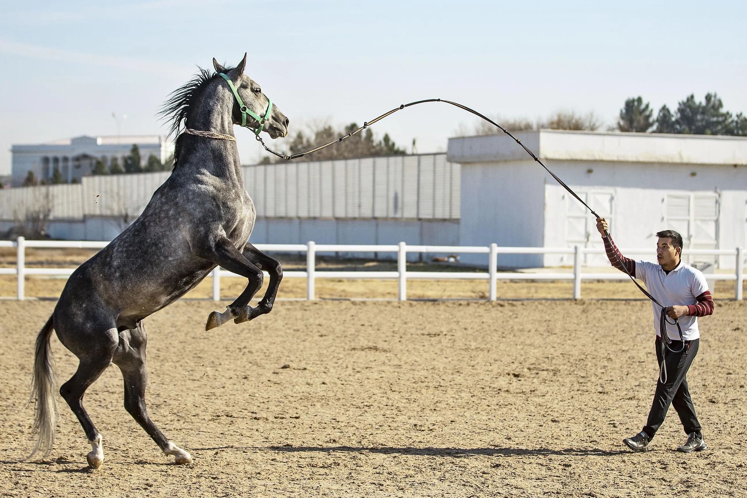 A Turkmen horse is seen in Ashgabat, Turkmenistan on November 30, 2021. Akhal-Teke also known as golden horse due to its distinctive golden metallic skin as they are rapid, intelligent and durable for hard conditions. The government established an institution called “State Association Turkmen Atlary” due to the special interest in horses in the country. (Photo by Aytac Unal/Anadolu Agency via Getty Images)