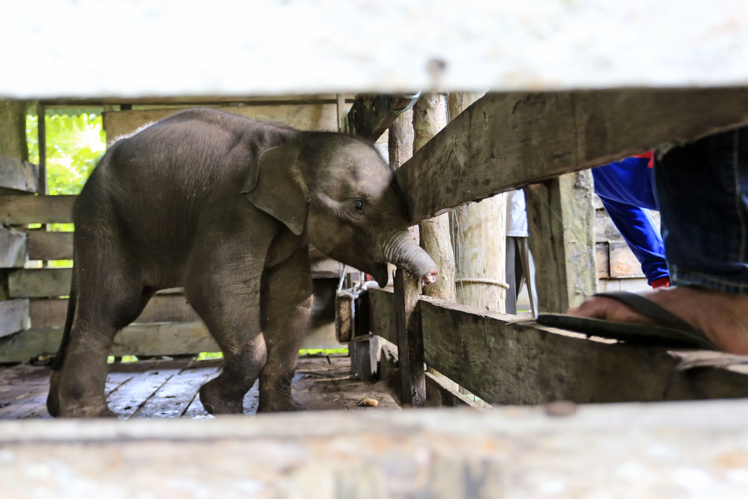 A Sumatran elephant calf that lost half of its trunk, is treated at an elephant conservation center in Saree, Aceh Besar, Indonesia, Monday, November 15, 2021. The baby elephant in Indonesia's Sumatra island has had half of her trunk almost severed off after being caught in what authorities alleged Monday was a trap set by poachers who prey on the endangered species. The trunk had to be amputated to save the elephant’s life. (Photo by Munandar/AP Photo)