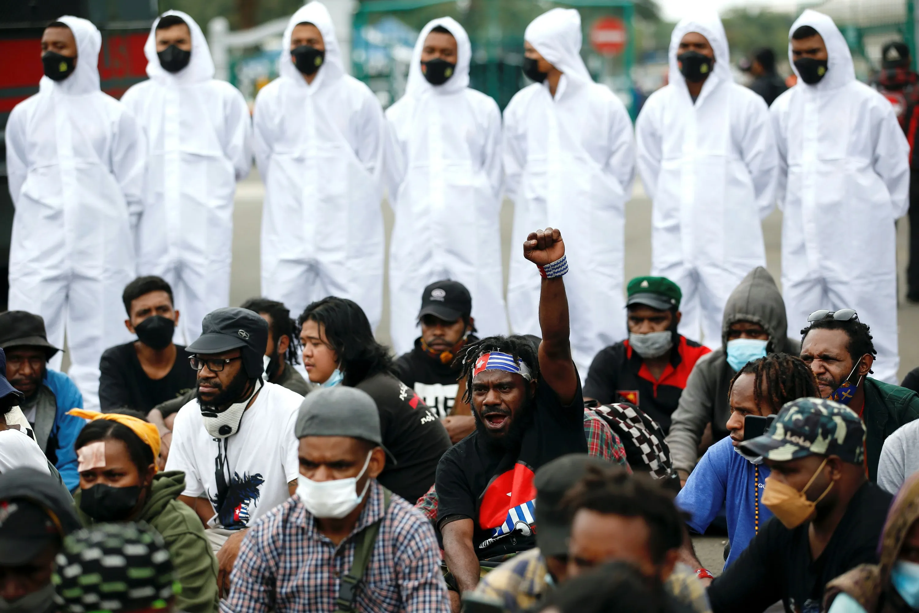 A Papuan activist wearing a bandana shouts slogans as he takes part in a rally calling for their right to self-determination in the Indonesian controlled part of Papua, during commemorations on the anniversary of West Papua's declaration of independence from Dutch colonial rule, outside the National Monument complex in Jakarta, Indonesia, December 1, 2021. (Photo by Willy Kurniawan/Reuters)