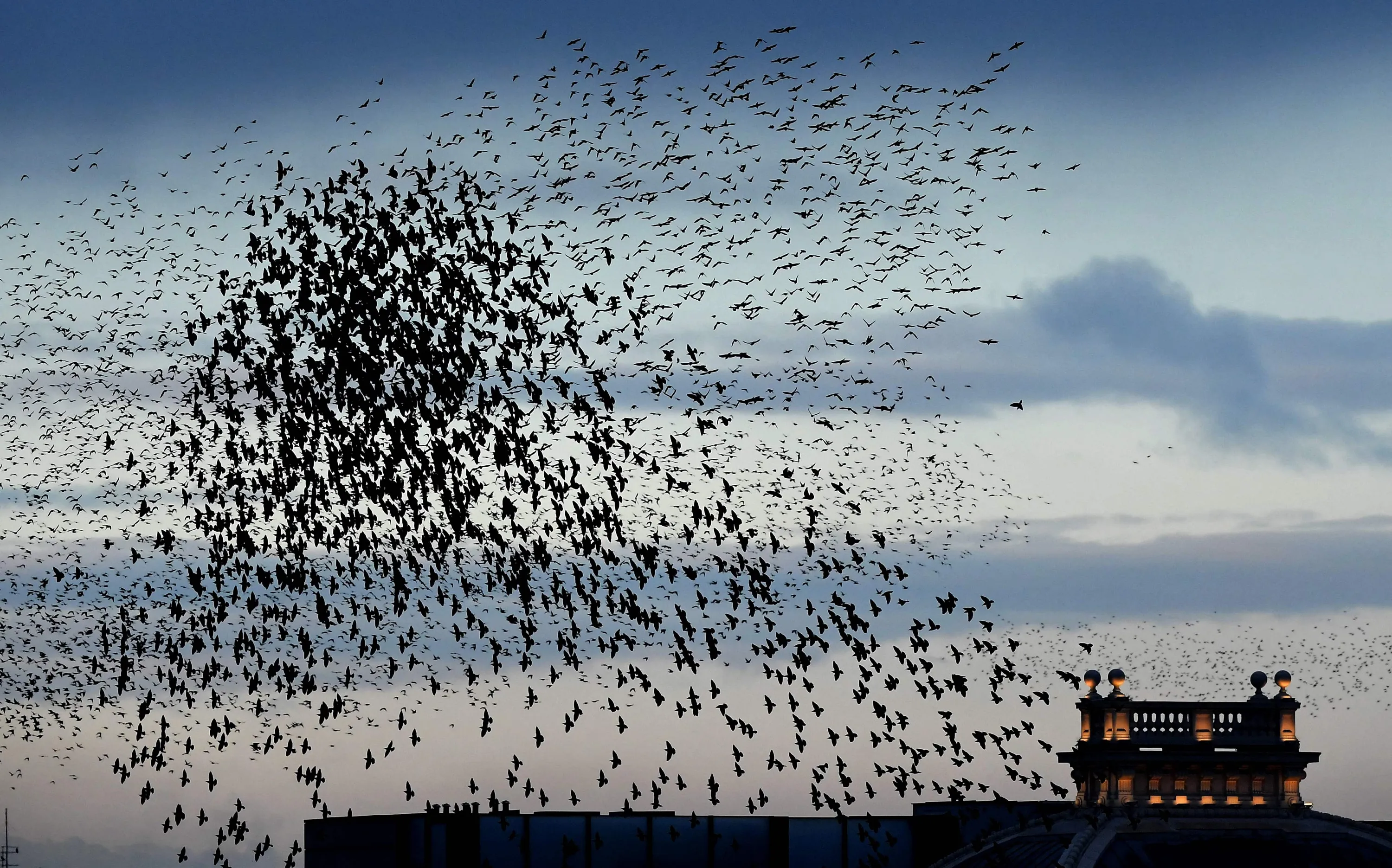 Starlings fly at sunset over central Milan on November 08, 2021. (Photo by Tiziana Fabi/AFP Photo)