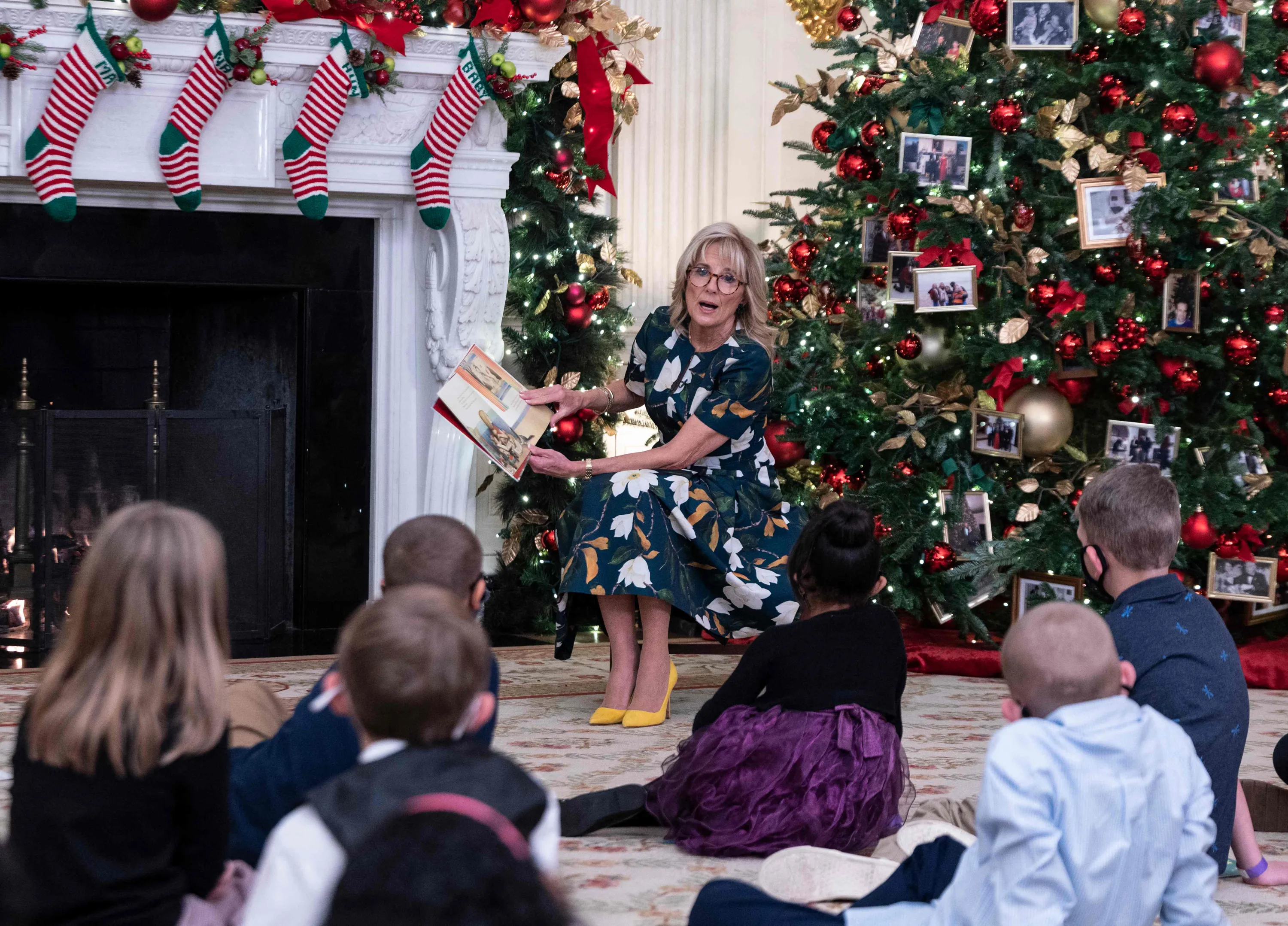 US First Lady Jill Biden reads to students from Malcolm Elementary School, from Waldorf, Maryland, during an event in the State Dining Room at the White House in Washington, DC on November 29, 2021. (Photo by Andrew Caballero-Reynolds/AFP Photo)