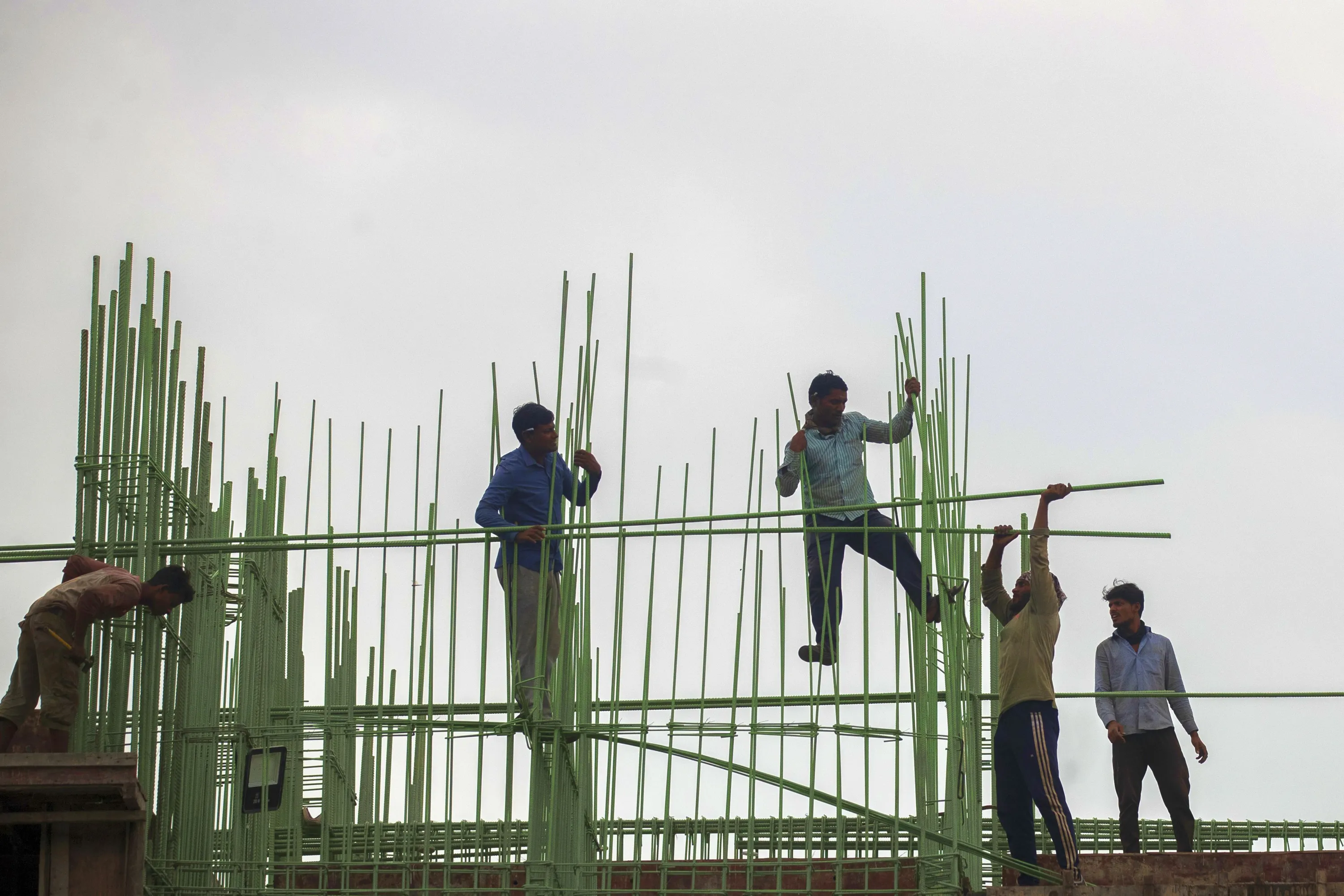 Laborers work at a building construction site in Mumbai, India, Tuesday, November 30, 2021. (Photo by Rafiq Maqbool/AP Photo)