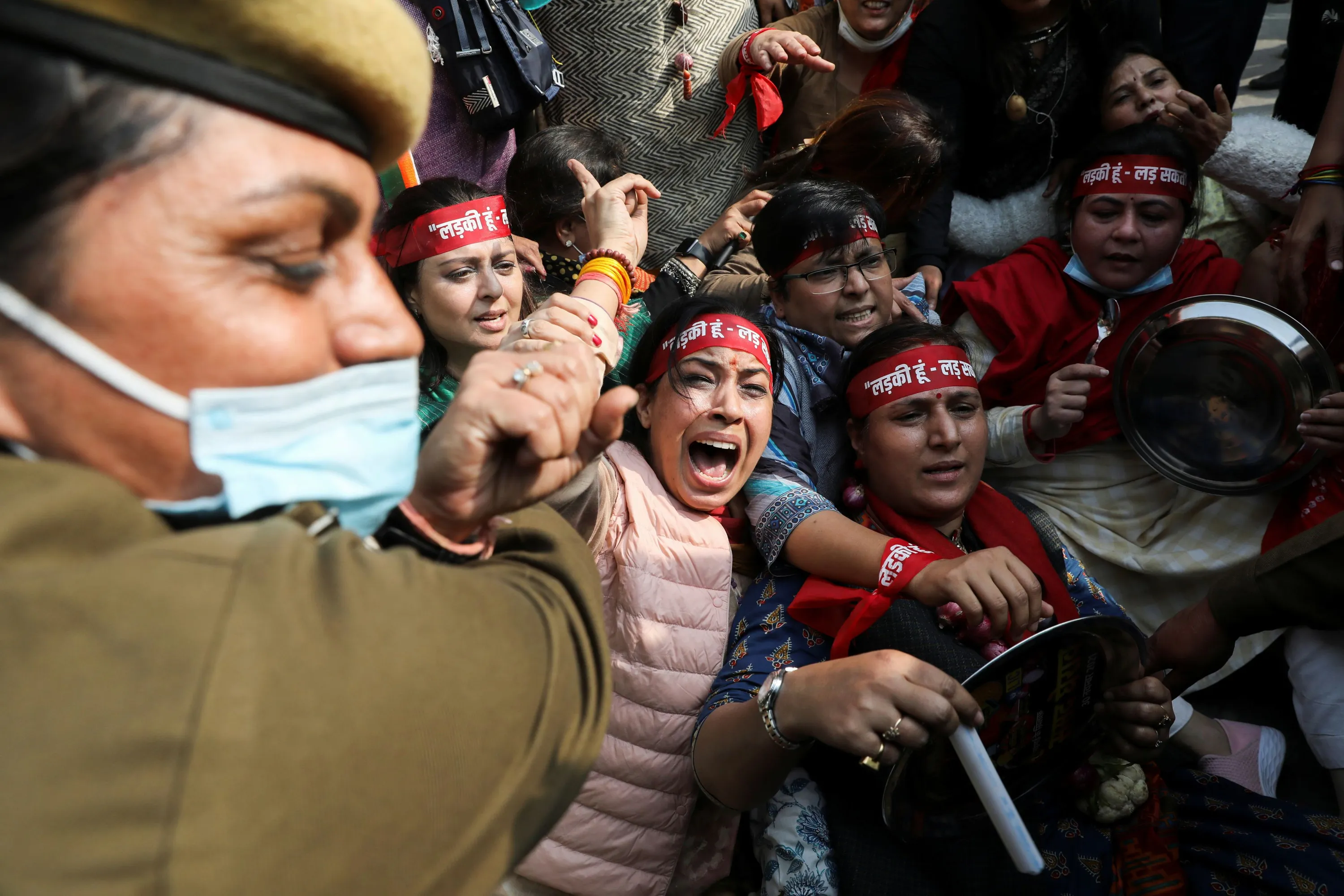 A police officer tries to detain the supporters of the women's wing of India's main opposition Congress Party during a protest against what they say is rising inflation in the country, in New Delhi, India, November 30, 2021. (Photo by Anushree Fadnavis/Reuters)