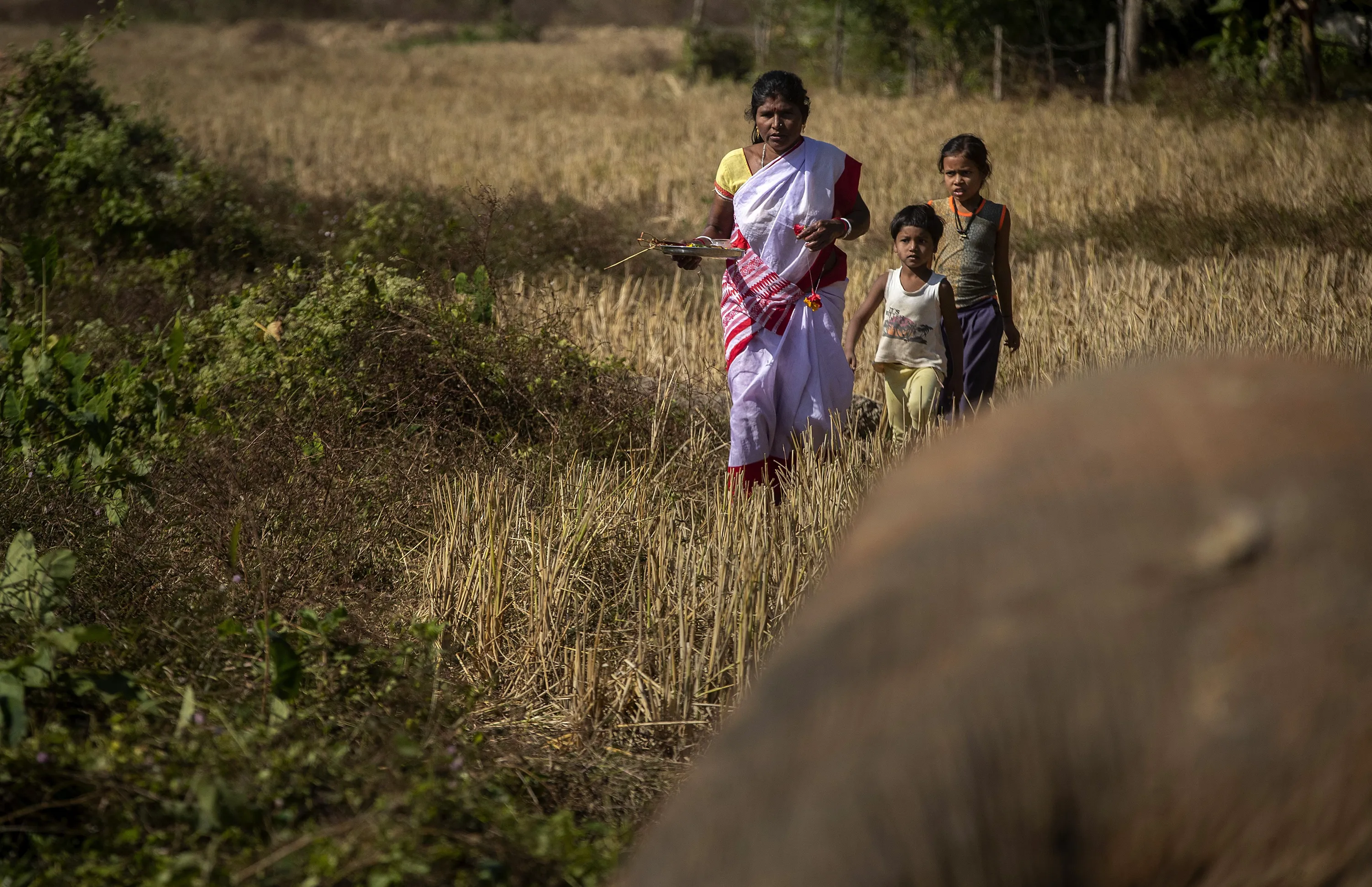 A woman arrives with her children to worship a wild male elephant, one of two killed by a train in Durung Pathar, in the northeastern Indian state of Assam, Wednesday, December 1, 2021. Speeding trains have run down dozens of wild elephants in Assam in the past, forcing the Indian Railways, which runs the trains, to regulate speed in known elephant corridors. Assam, which has a history of man-elephant conflict, has an estimated 5,000 wild Asiatic elephants. (Photo by Anupam Nath/AP Photo)