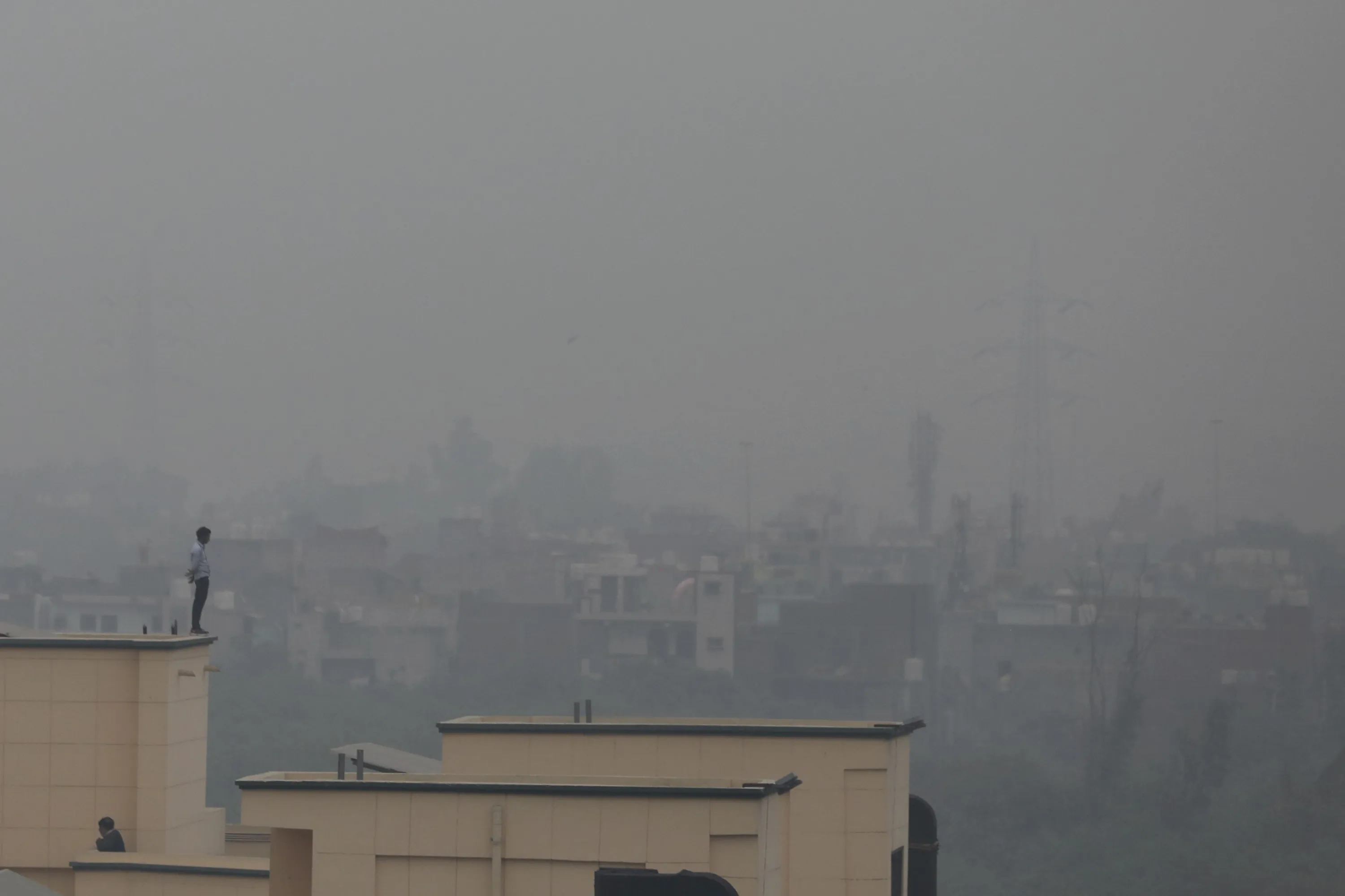 A man is seen standing on the ledge of a building as smog envelopes the horizon in New Delhi, India, Thursday, December 2, 2021. (Photo by Altaf Qadri/AP Photo)