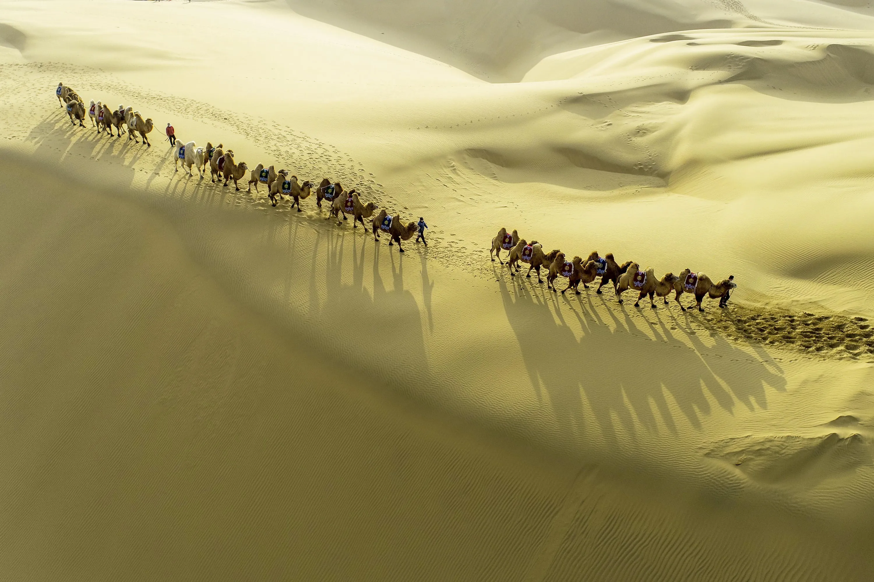 Aerial view of camels walking in a line at Kubuqi Desert on November 29, 2021 in Ordos, Inner Mongolia Autonomous Region of China. (Photo by Wang Zheng/VCG via Getty Images)