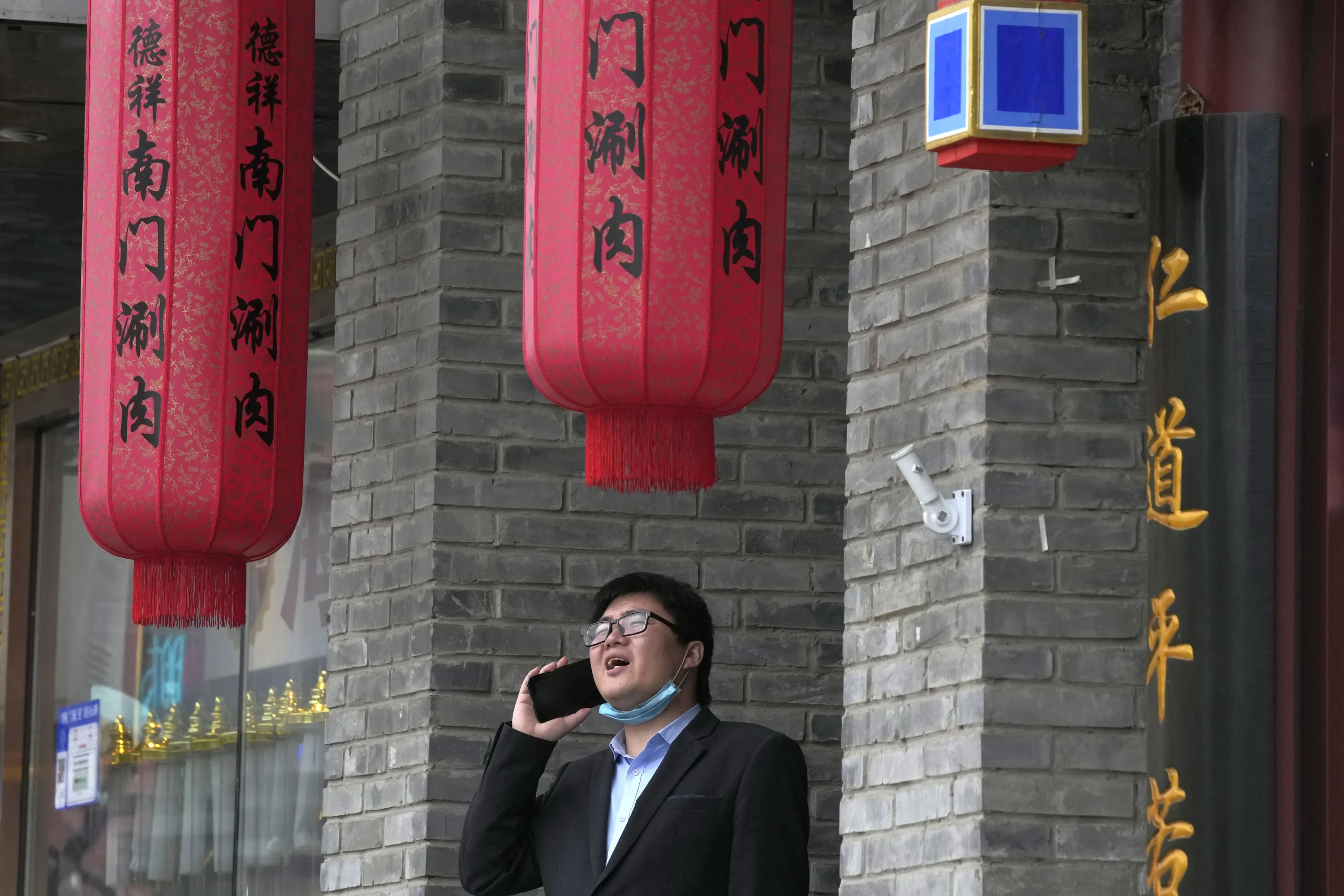 A man lowers his mask to speak on his phone outside a restaurant in Beijing, China, Monday, November 29, 2021. As cases of a new coronavirus variant are confirmed around the world, an increasing number of countries are tightening their borders as fear spreads of yet another extension of pandemic suffering. (Photo by Ng Han Guan/AP Photo)