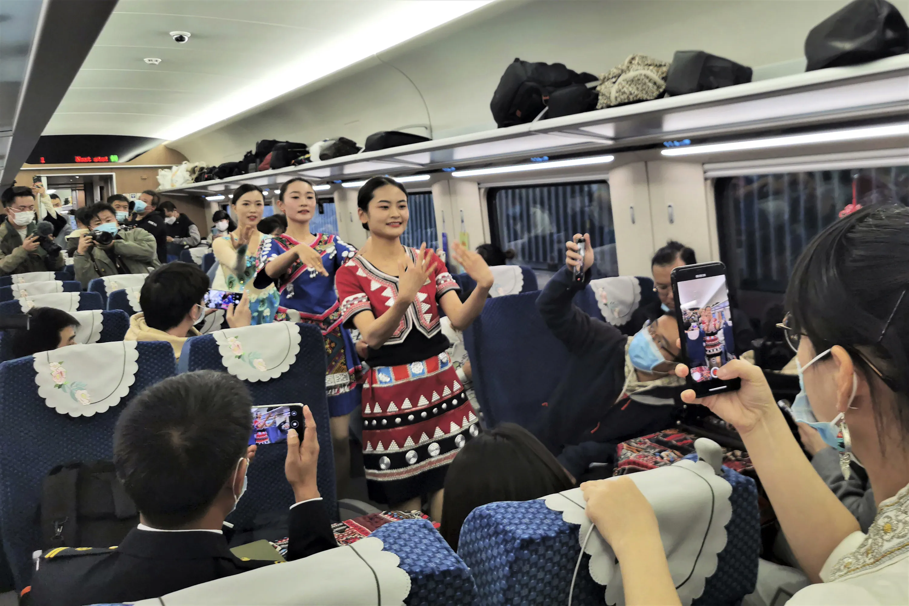 Women in ethnic dresses perform on a passenger carriage of the first regular train service on the Chinese section of the railway between Kunming and Vientiane, the Laotian capital, after its debut ceremony in Kunming in southwestern China's Yunnan province, Friday, December 3, 2021. The railway is one of hundreds of projects under Beijing's Belt and Road Initiative to build ports, railways and other facilities across Asia, Africa and the Pacific. (Photo by Chinatopix via AP Photo)