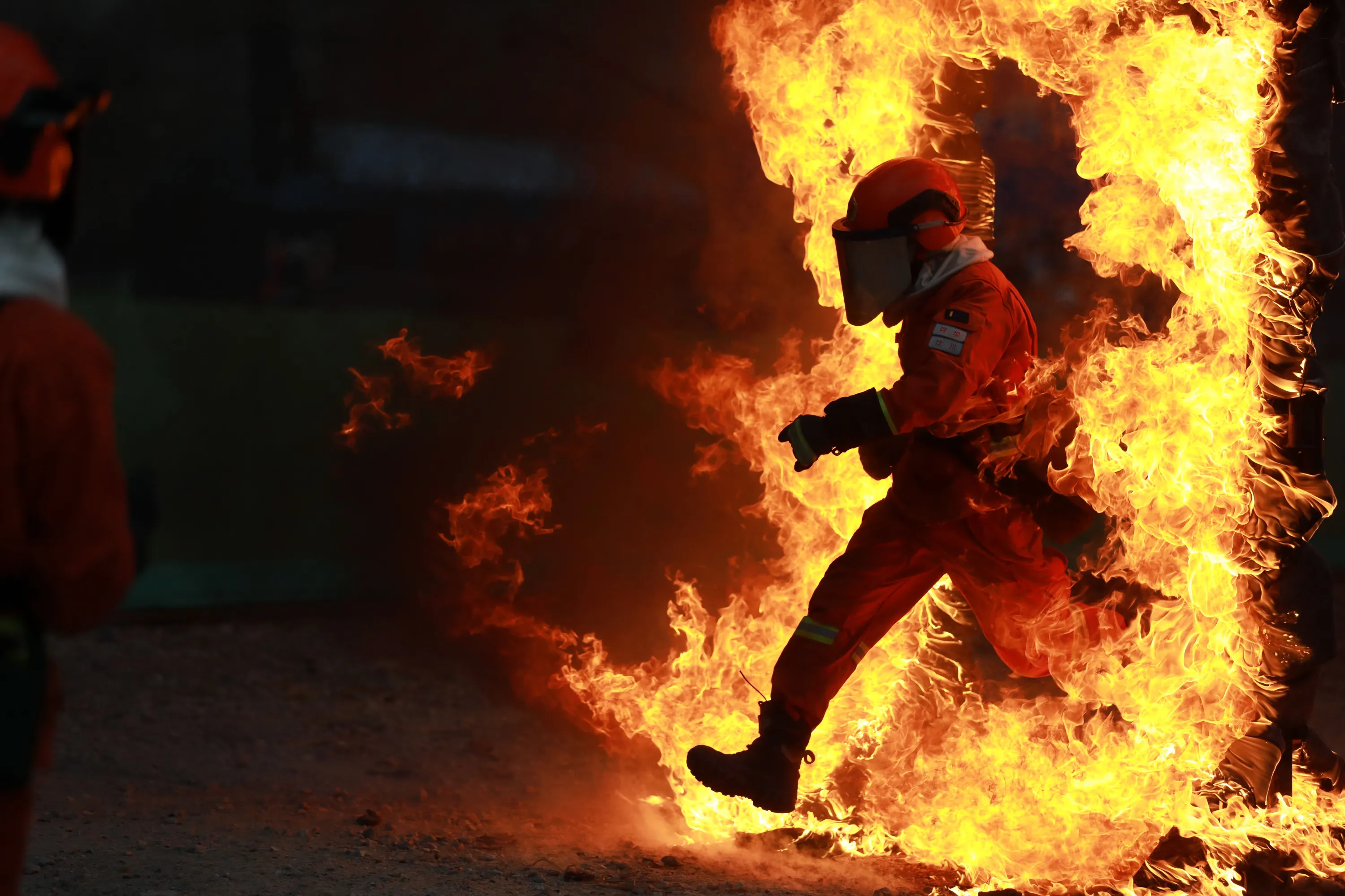A firefighter passes through fire in a firefighting drill on December 7, 2021 in Aba Tibetan and Qiang Autonomous Prefecture, Sichuan Province of China. (Photo by Zeng Peng/VCG via Getty Images)