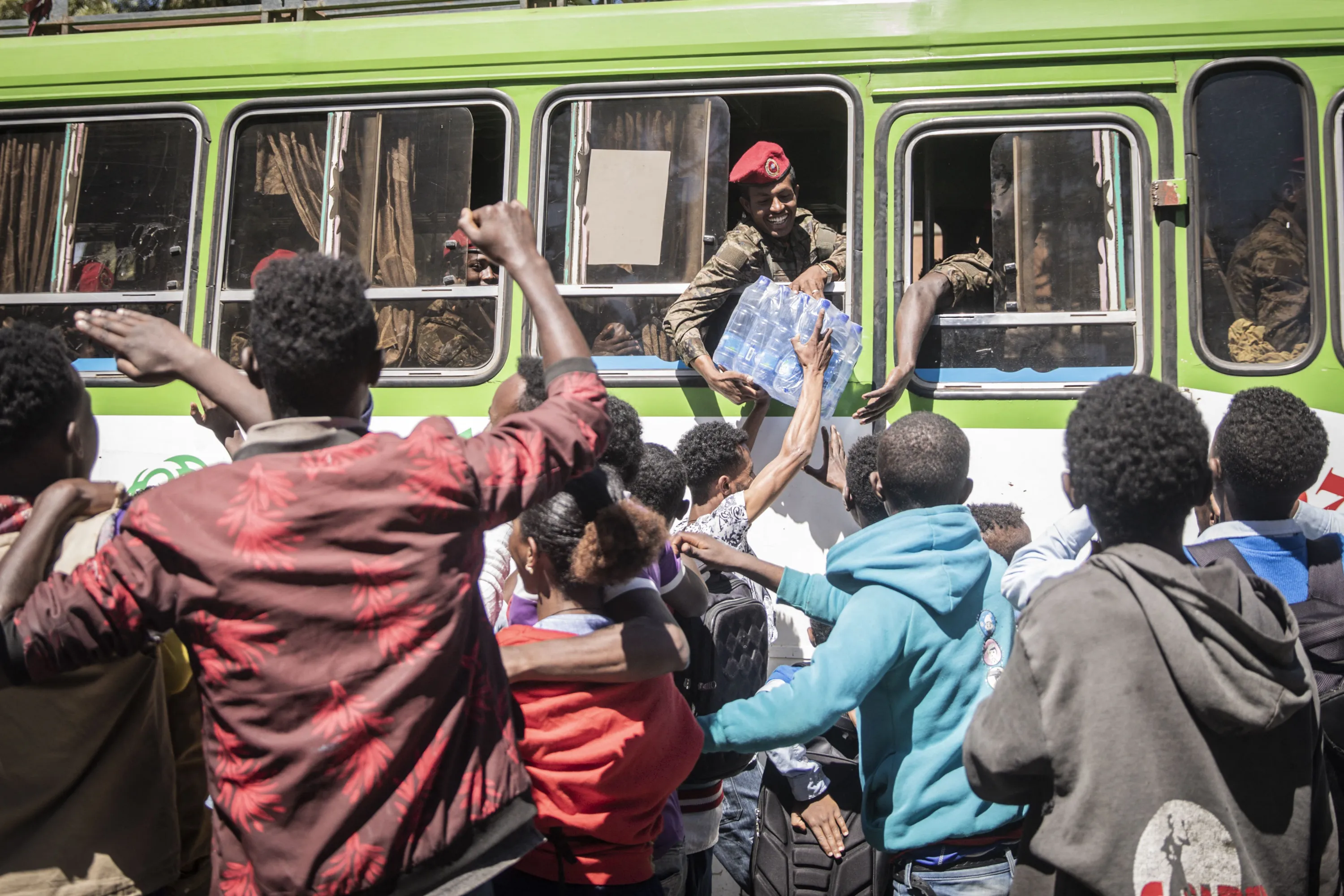 A soldier receives a pack of bottled water as residents react while a convoy of soldiers from the Ethiopian National Defence Forces drive through Sendafa on December 7, 2021. (Photo by Amanuel Sileshi/AFP Photo)