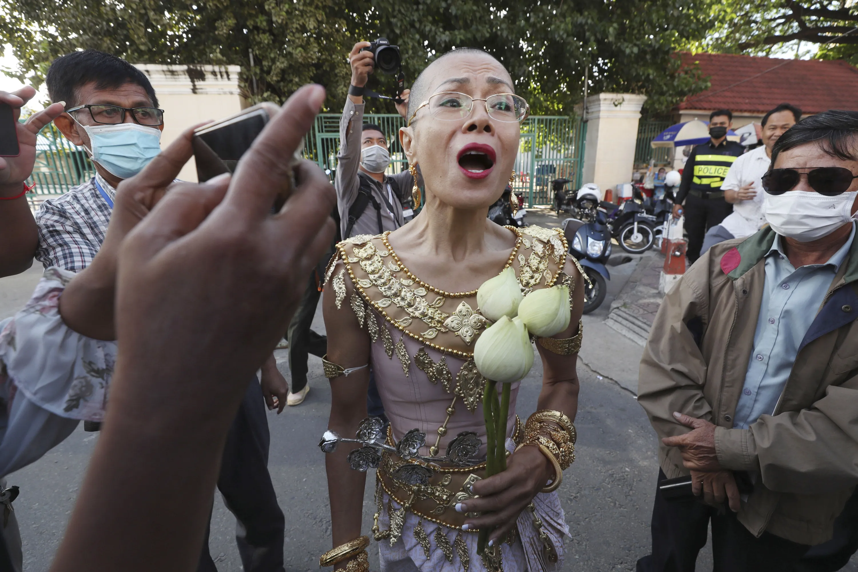 Theary Seng, a Cambodian-American lawyer, dressed in a traditional Khmer Apsara dance costume, speaks to media as she arrives to continue her trial in the municipal court in Phnom Penh, Cambodia, Tuesday, December 7, 2021. Seng and over 40 other defendants charged with treason for taking part in nonviolent political activities were summoned back to court Tuesday to continue their trial that had been suspended since November 2020 due to the coronavirus. (Photo by Heng Sinith/AP Photo)