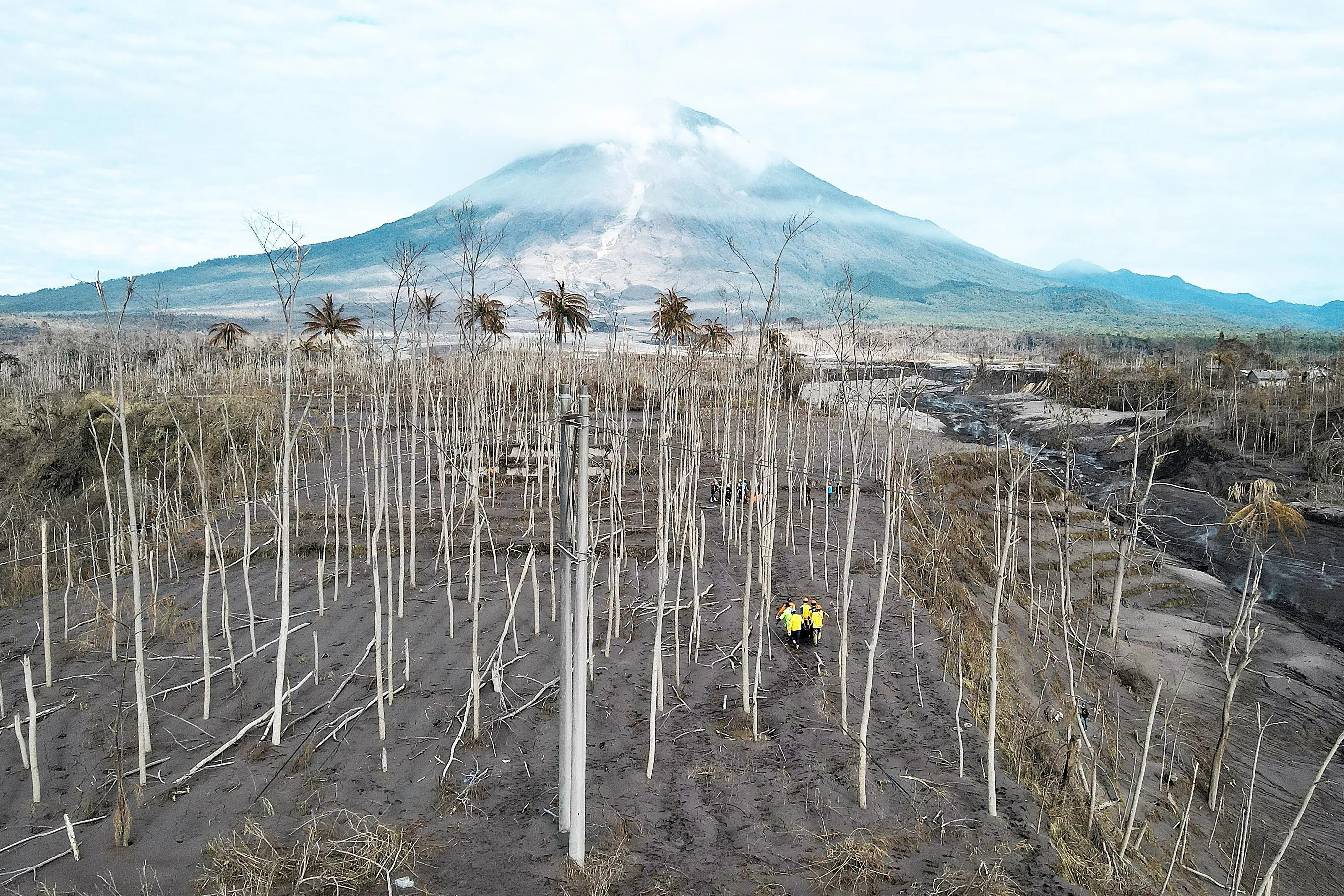 Rescue volunteers carry a body bag at an area affected by the eruption of Mount Semeru volcano in Curah Kobokan, Pronojiwo district, Lumajang, Indonesia, December 7, 2021. Picture taken with a drone. (Photo by Willy Kurniawan/Reuters)