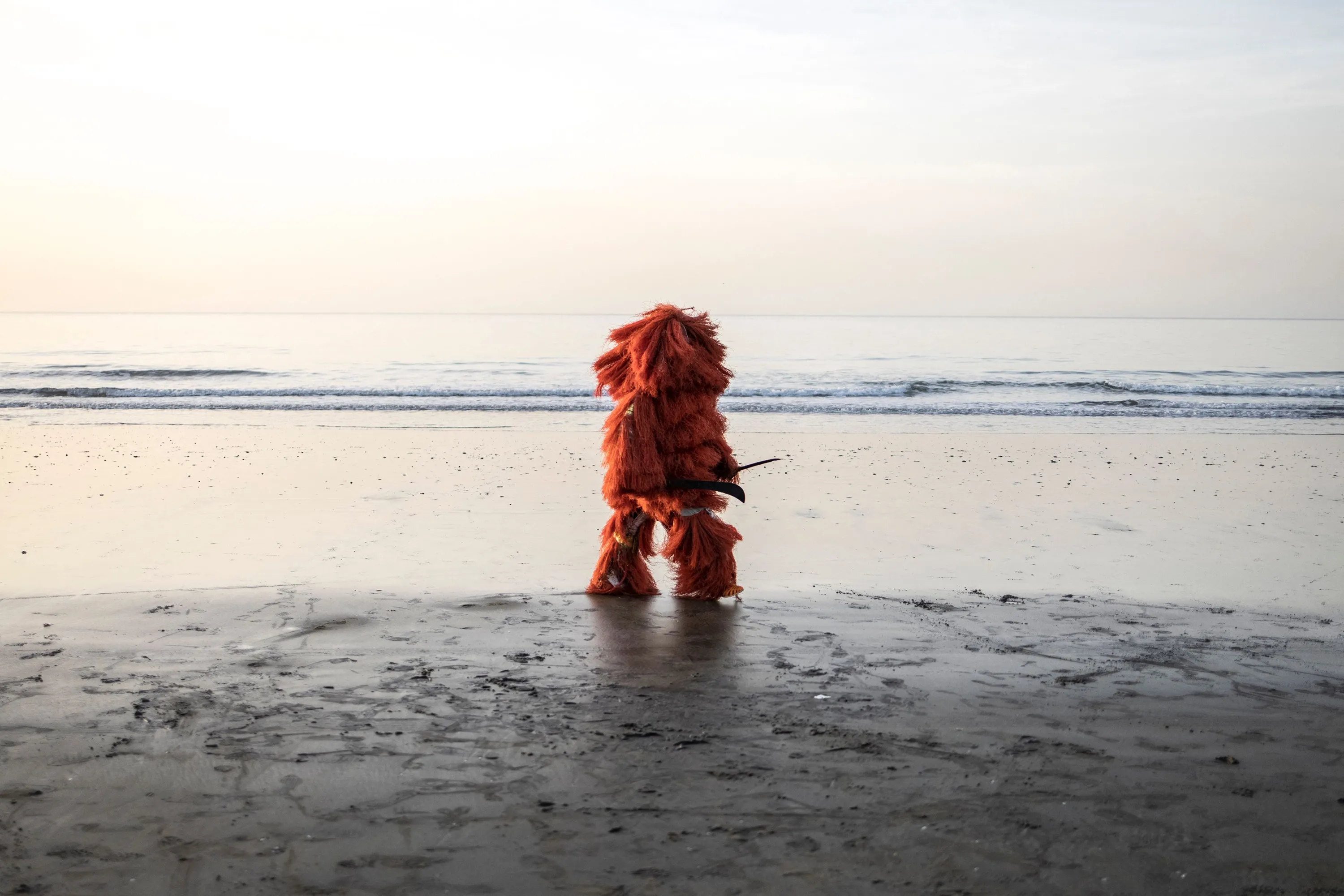 A man wears a traditional Kankurang mask along the beach in the popular tourist area of Senegambia in Banjul on December 6, 2021. The Kankurang traditionally is said to be a protector spirit, warding off evil. (Photo by John Wessels/AFP Photo)