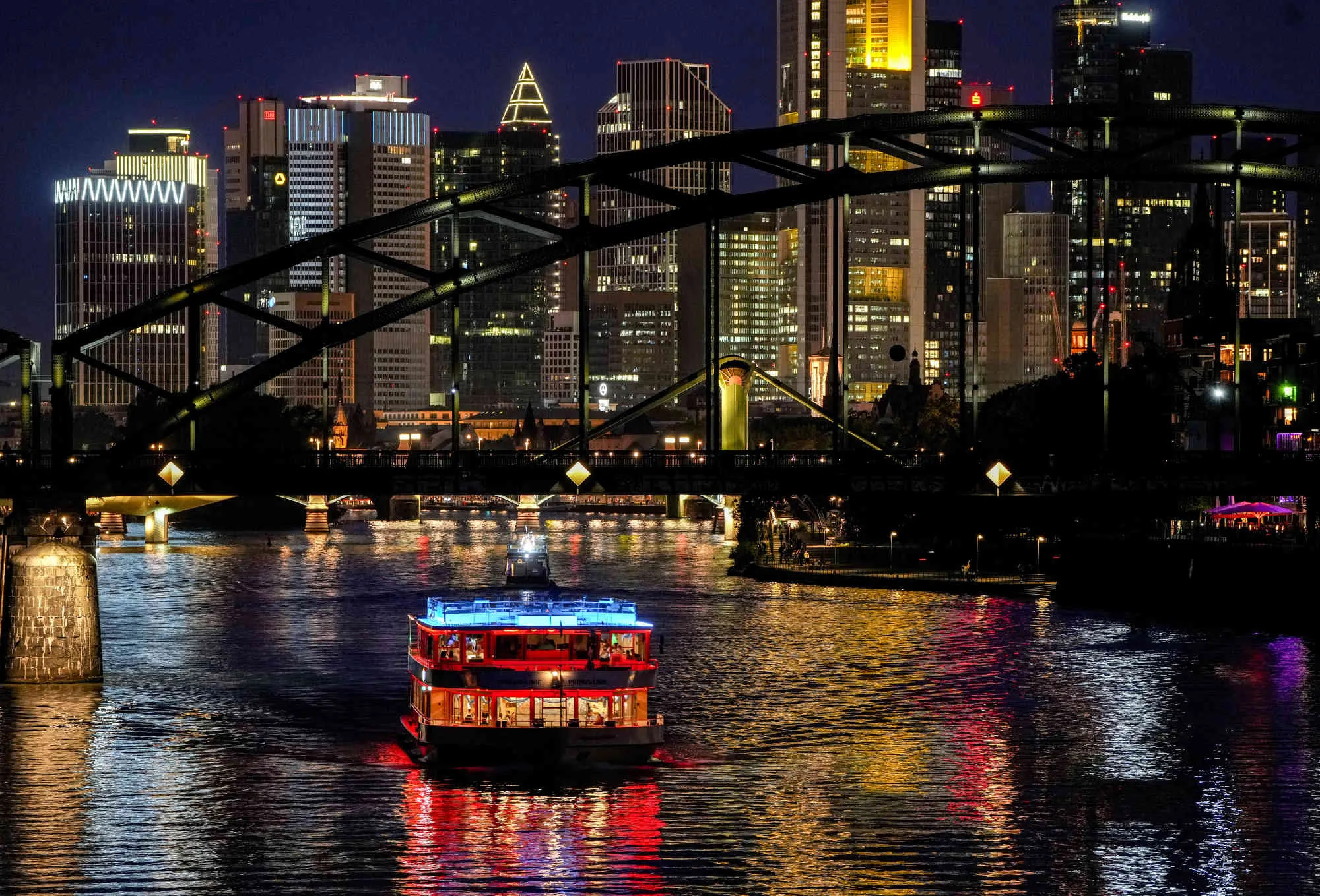 An illuminated party boat cruises over the river Main with the European Central Bank at right in Frankfurt, Germany, Saturday, October 2, 2021. (Photo by Michael Probst/AP Photo)